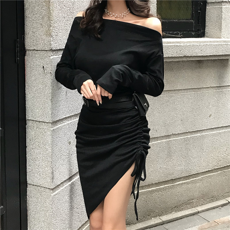 / 不規則包臀裙女秋裝新款氣質露肩長袖連衣裙子抽繩修身顯瘦小黑裙