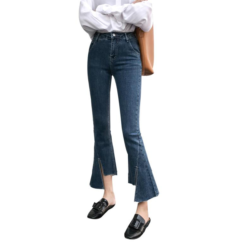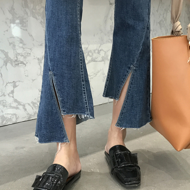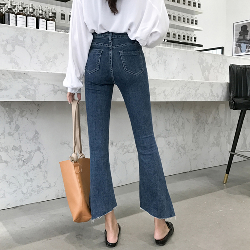 復古風不規則開叉微喇牛仔褲秋裝女2018新款高腰修身毛邊九分褲子