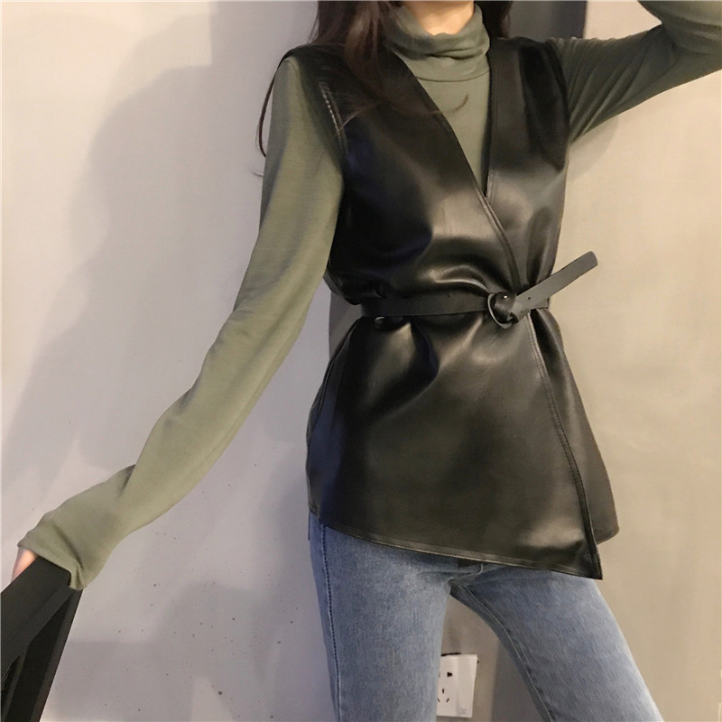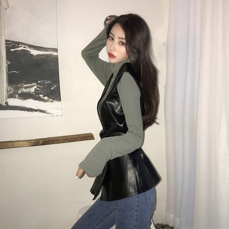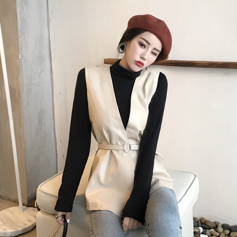時尚兩件套高領外套秋女2018新款女裝長袖打底衫上衣無袖皮馬甲潮