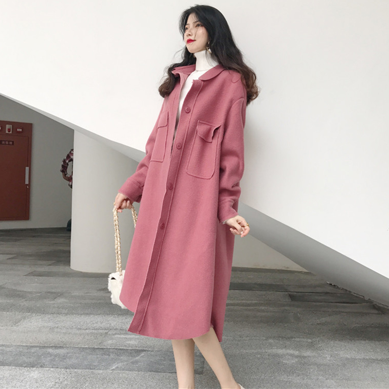 秋冬裝女新款2018流行寬松毛呢外套女韓版口袋中長款過膝呢子大衣
