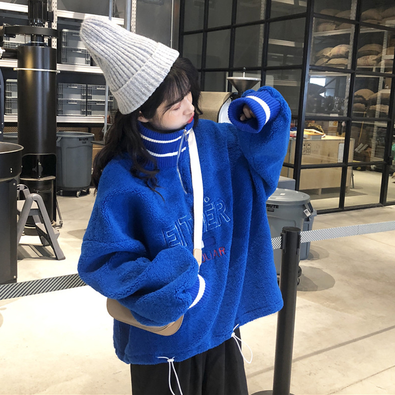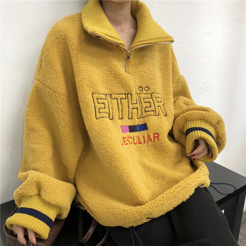 秋冬女裝2018新款慵懶風羊羔毛高領衛衣韓版字母長袖外套時尚上衣