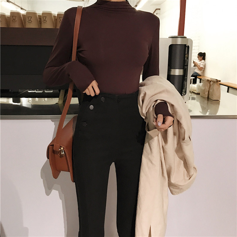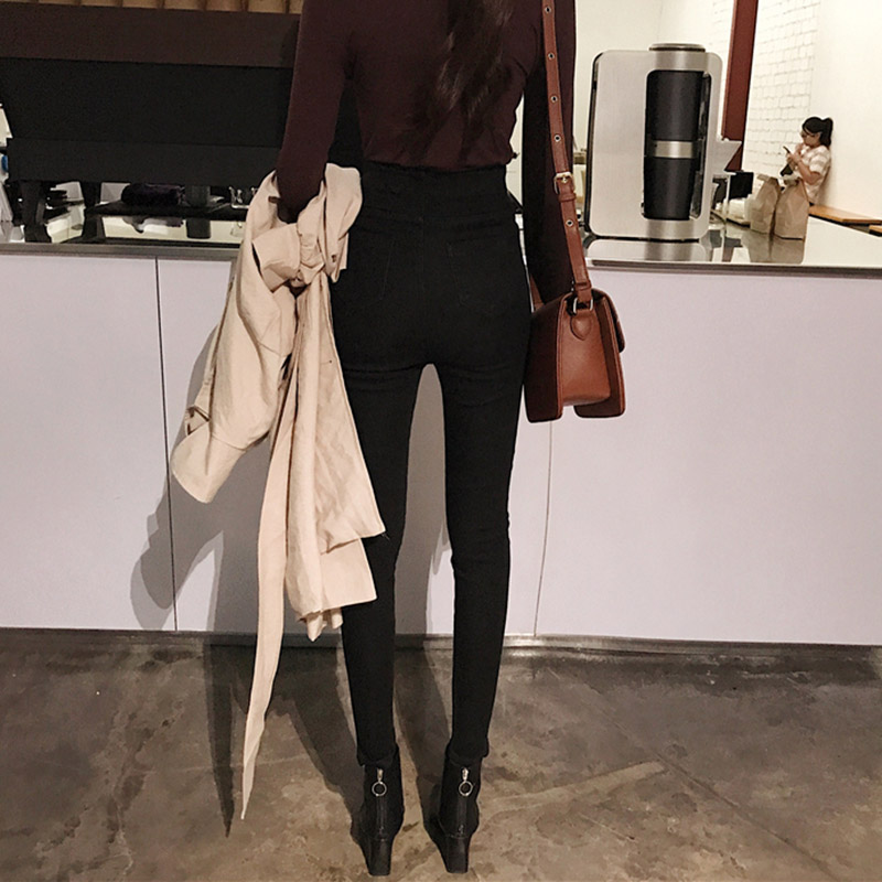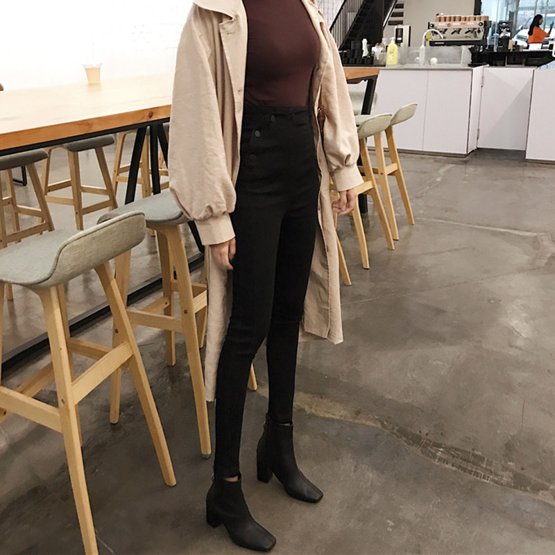 / 時尚排扣高腰緊身小腳鉛筆褲子秋裝女2018新款修身顯瘦黑色牛仔褲