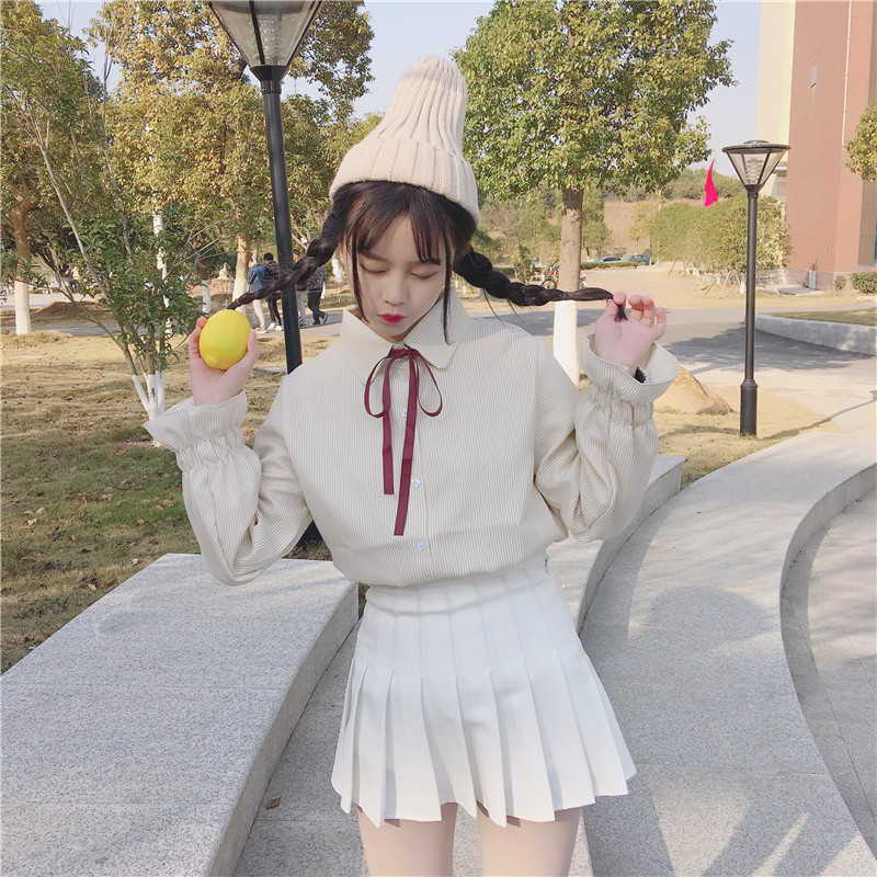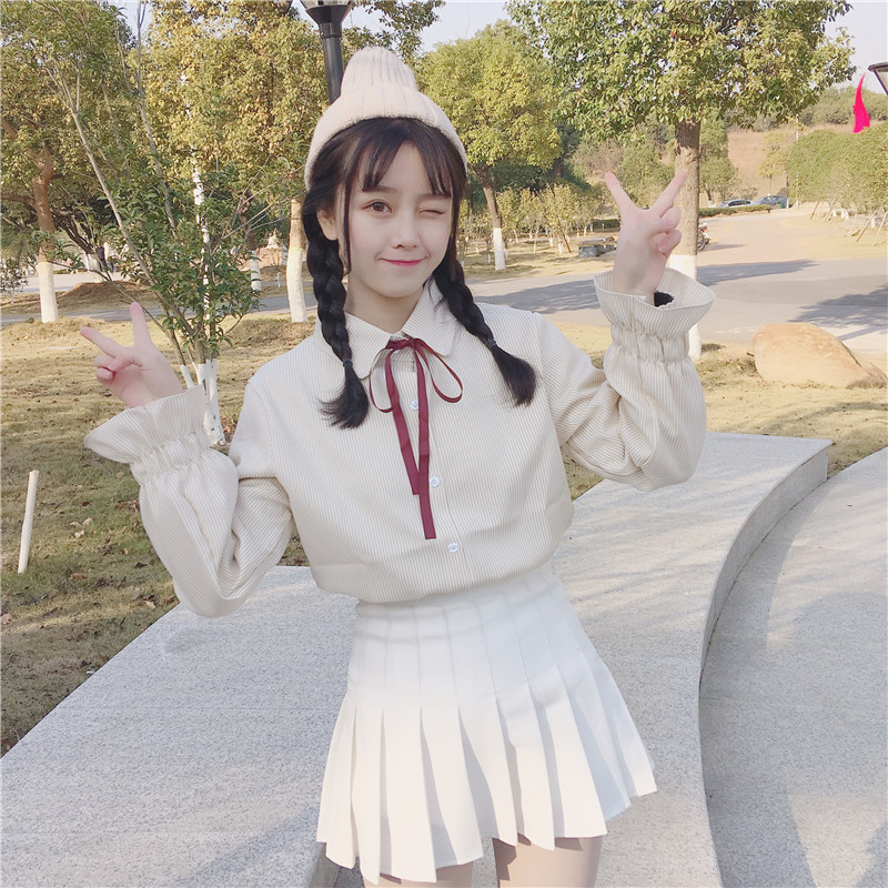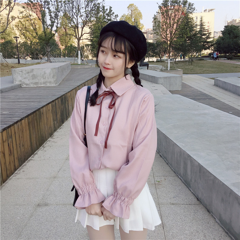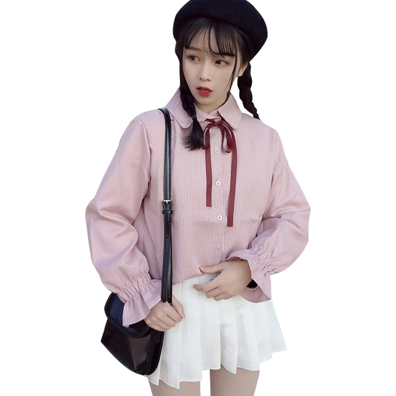 / 秋裝女2018新款甜美小清新蝴蝶結長袖白襯衫上衣學生系帶打底襯衣