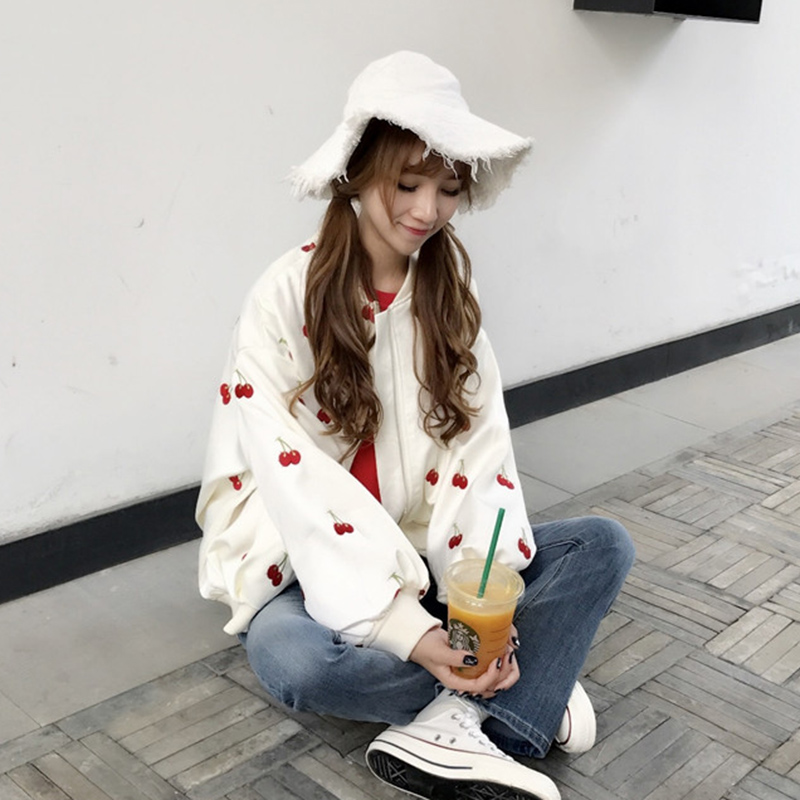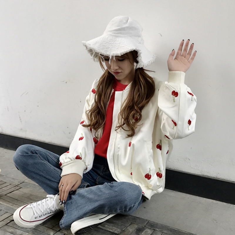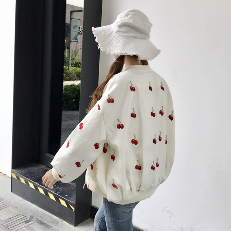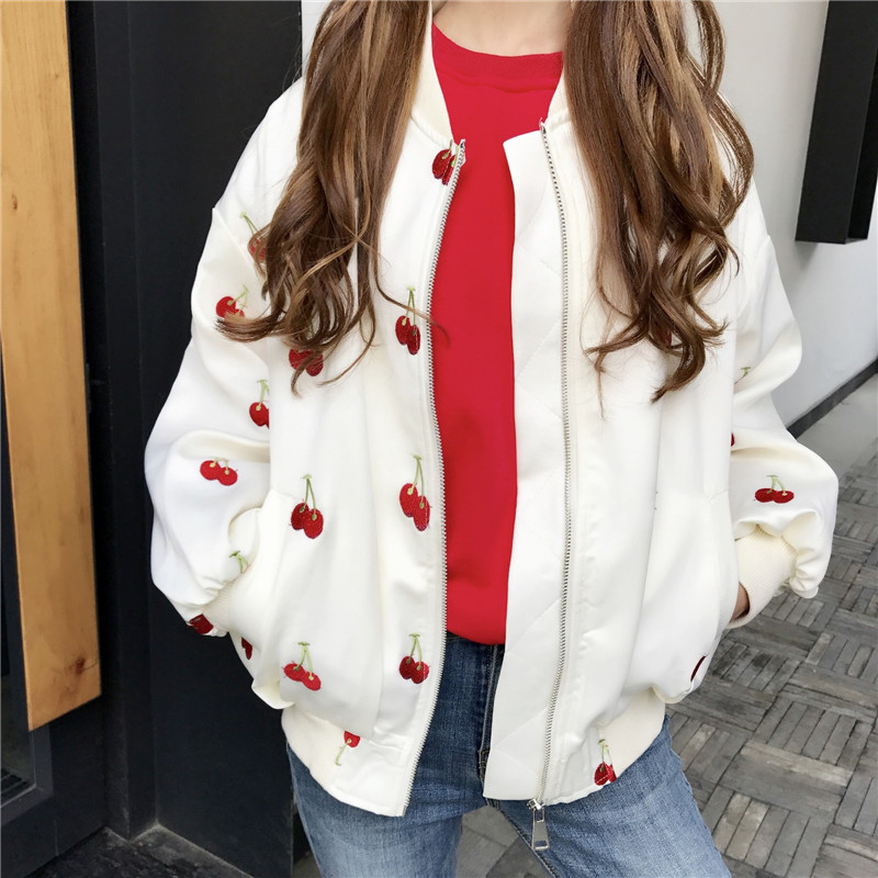 / 棒球服外套秋裝女2018新款休閑寬松長袖上衣櫻桃印花飛行員夾克衫