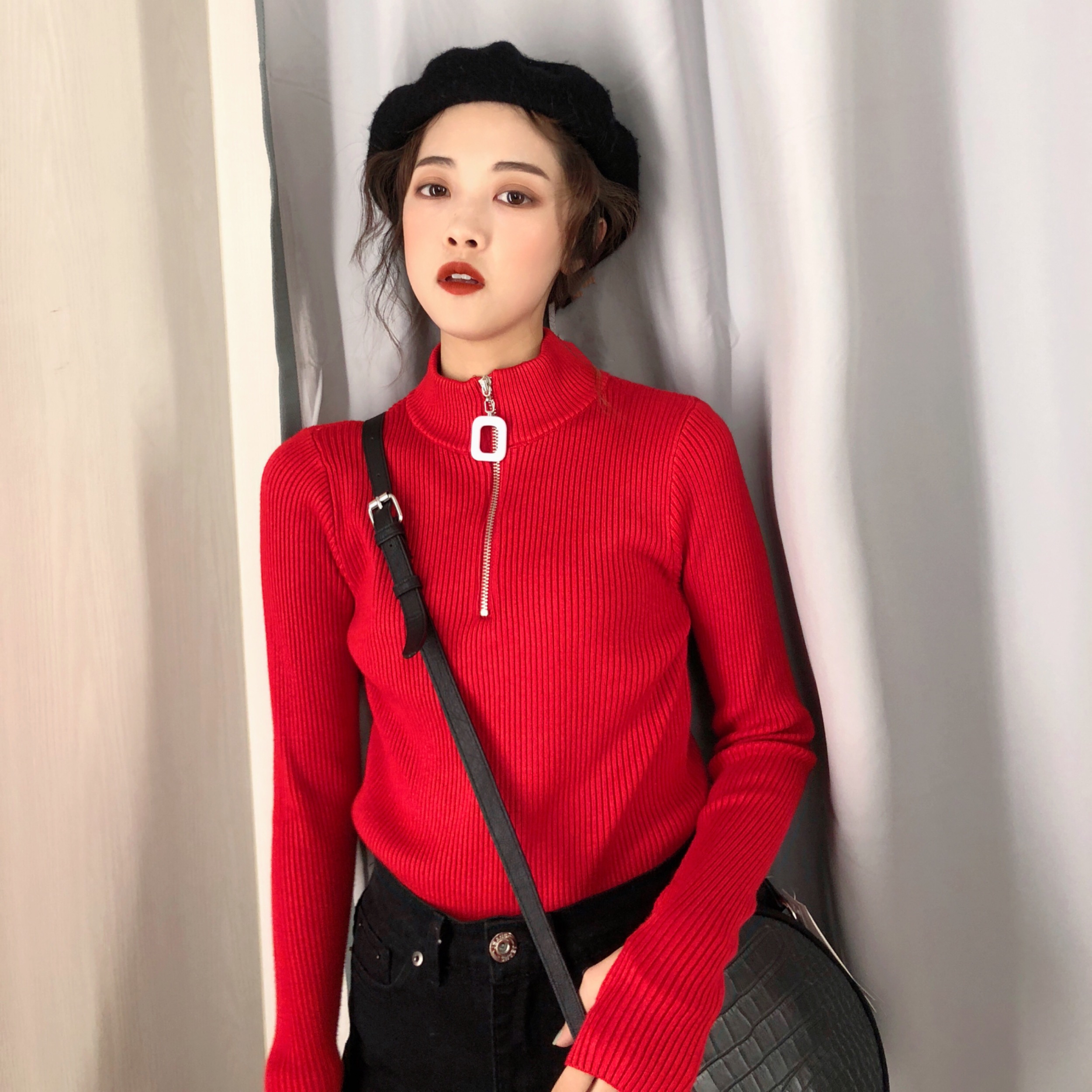 秋冬韓版純色修身顯瘦拉鏈半高領長袖打底衫套頭針織衫毛衣上衣女