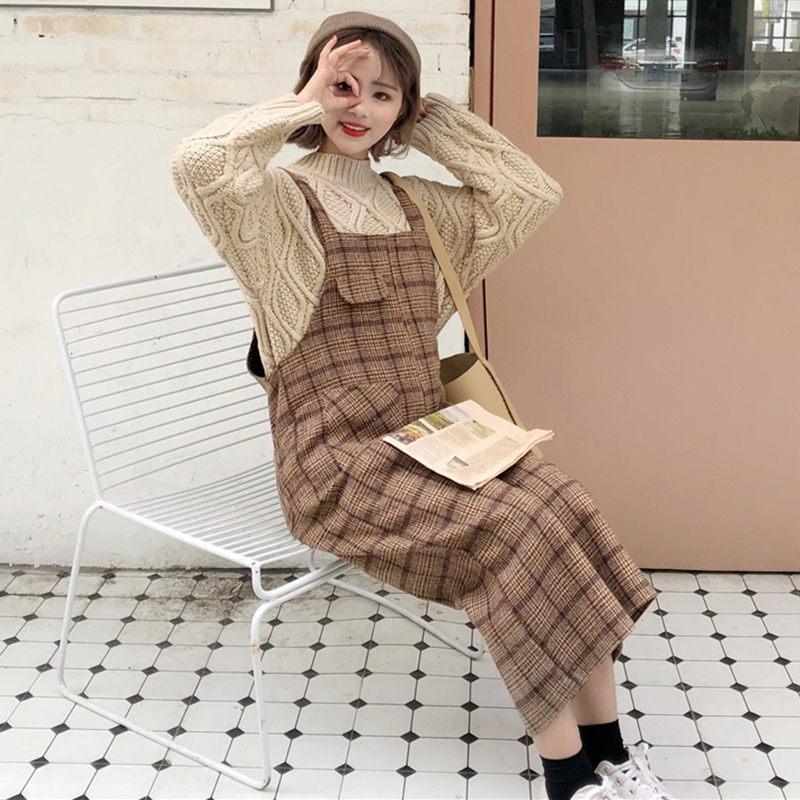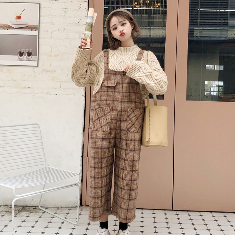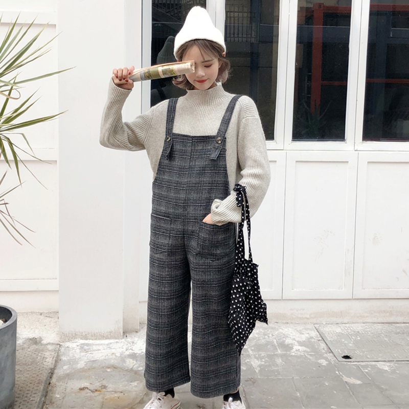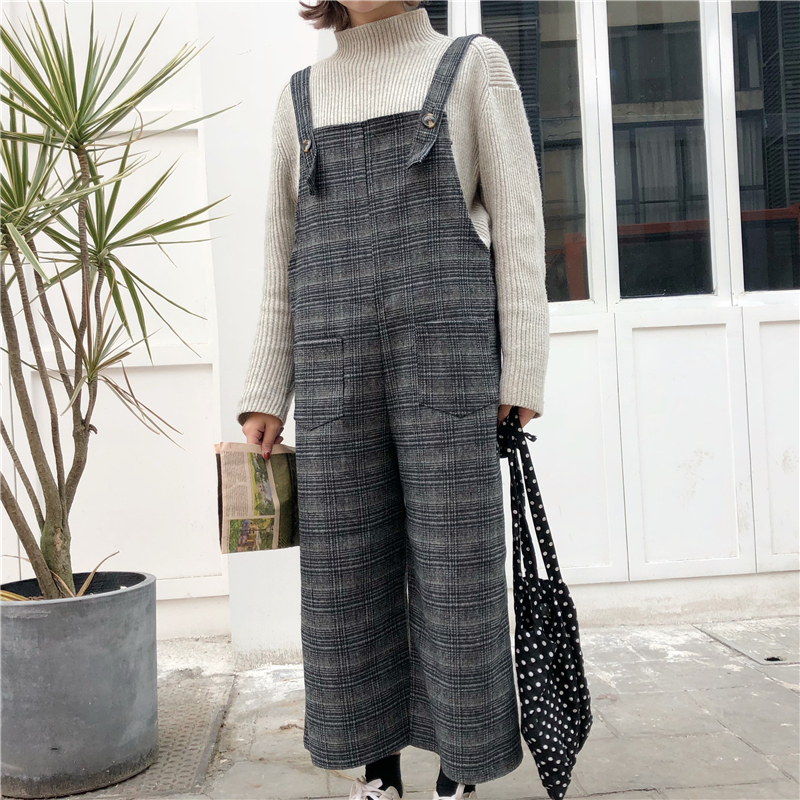 格子背帶褲秋冬女裝新款學院風寬松休閑闊腿褲學生呢子九分連體褲