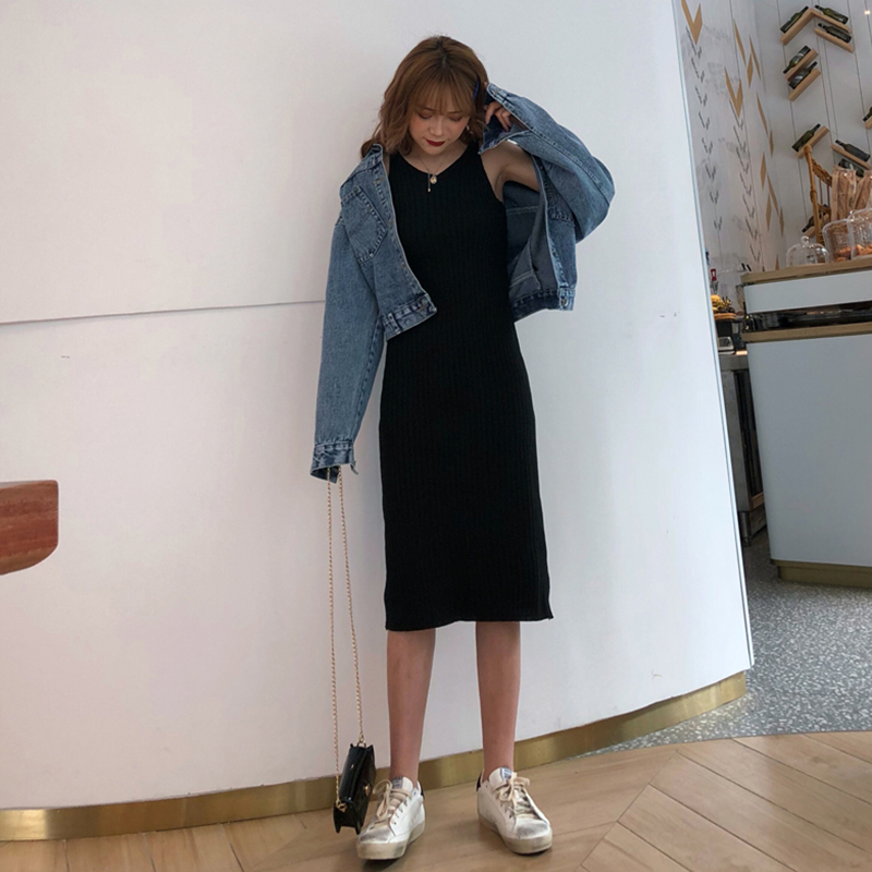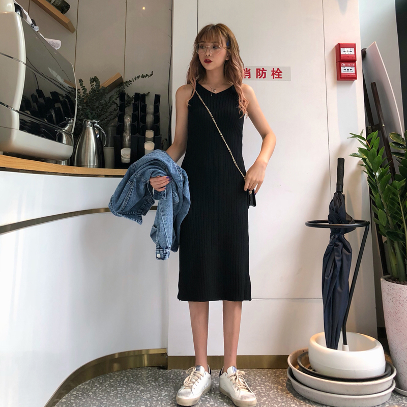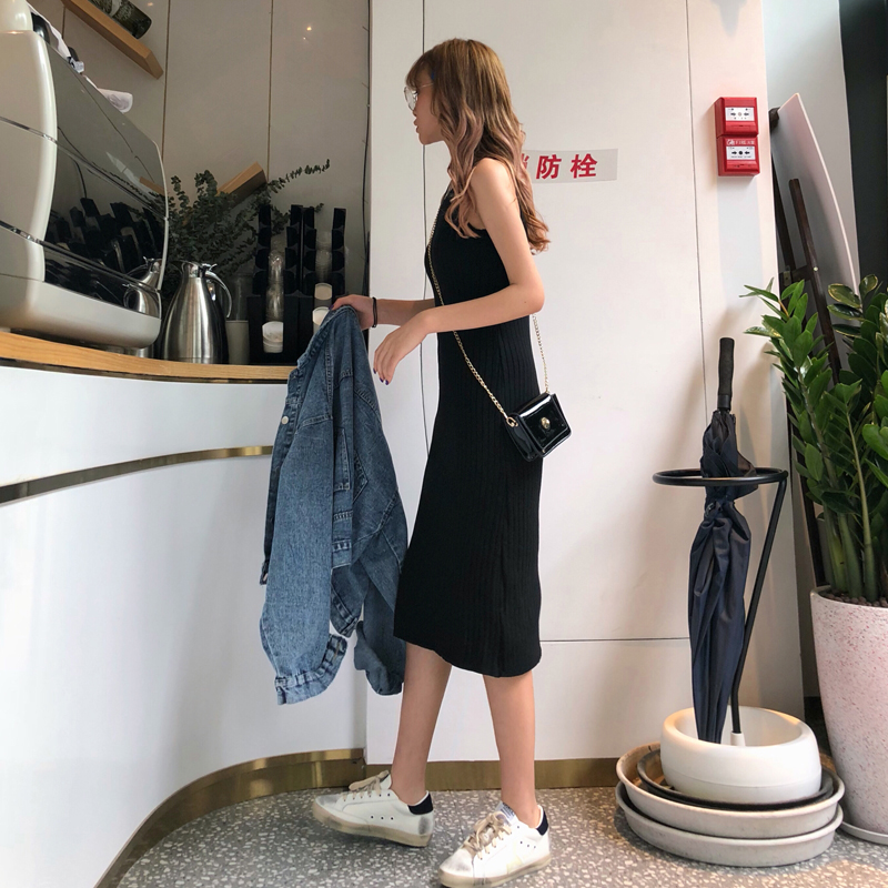 / 秋裝女2018新款港味氣質修身針織吊帶連衣裙子時尚黑色打底中長裙