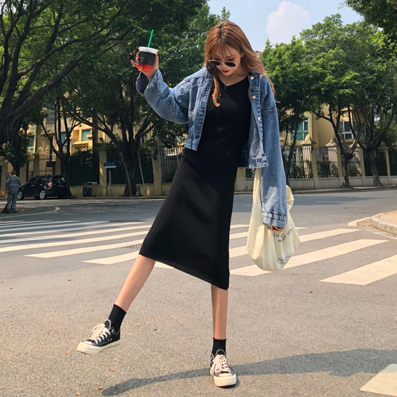 秋裝女2018新款港味氣質修身針織吊帶連衣裙子時尚黑色打底中長裙