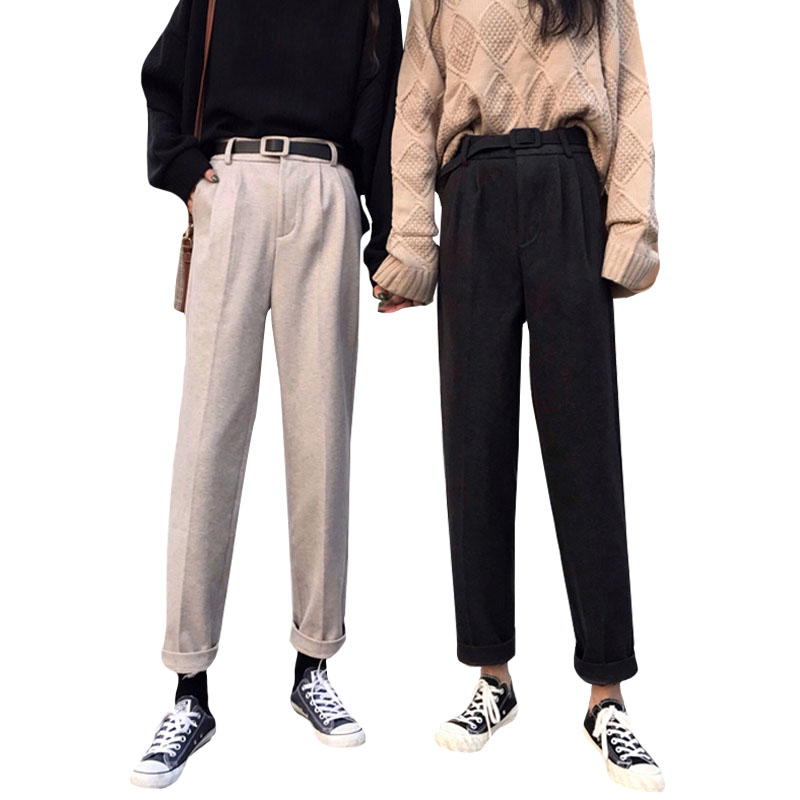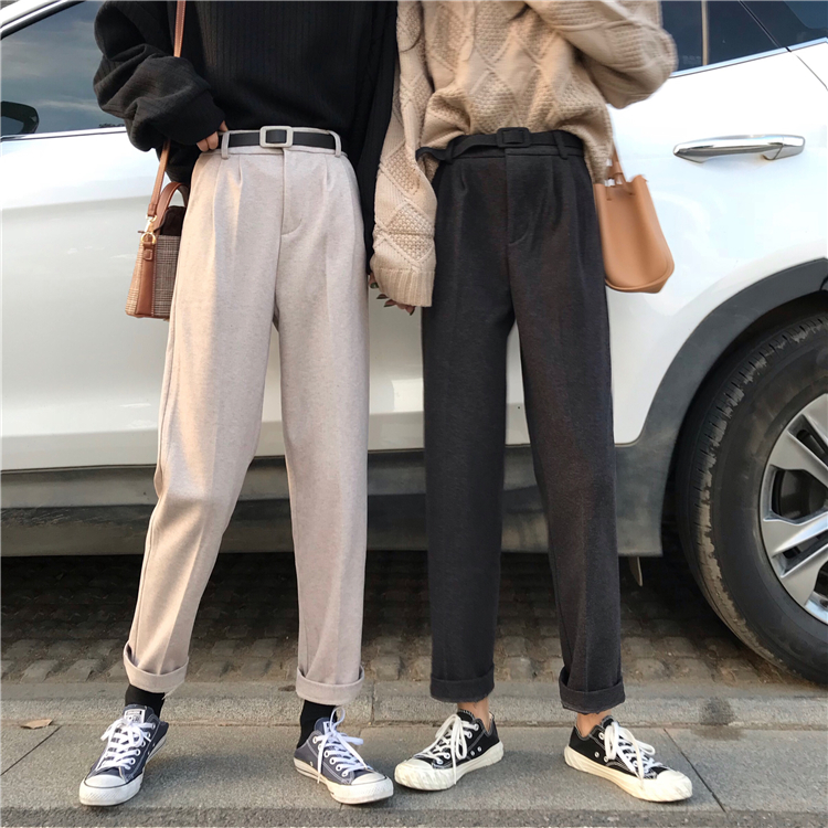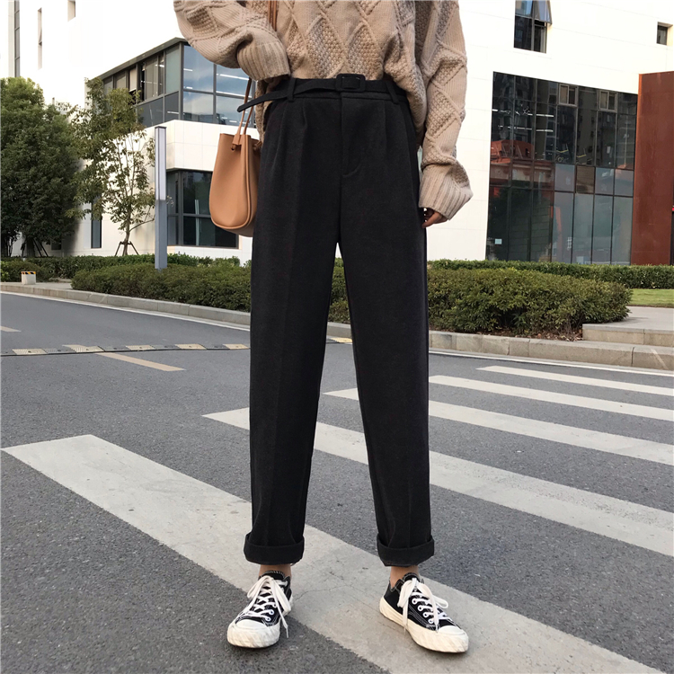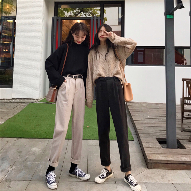 / 秋季韓版復古高腰直筒褲休閑褲chic寬松加厚闊腿褲長褲學生褲子女
