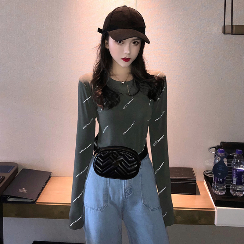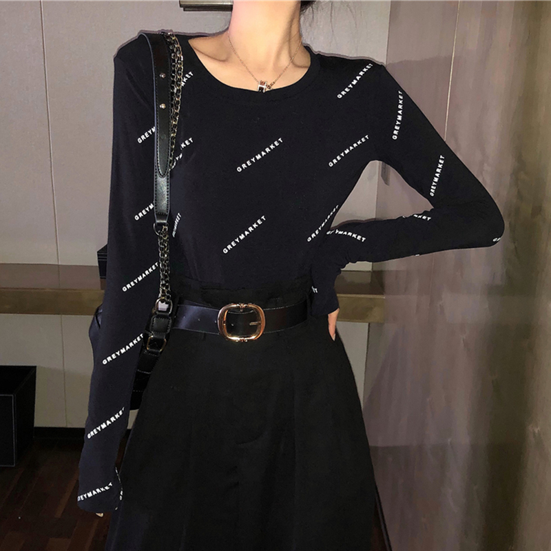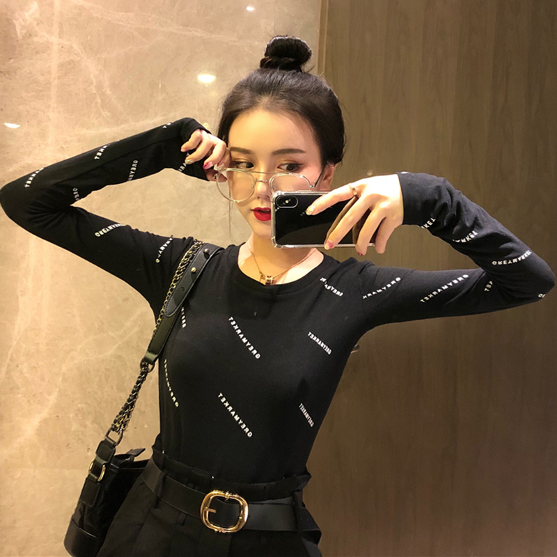/ 個性印花T恤秋裝女2018新款修身彈力打底衫時尚黑色圓領長袖上衣