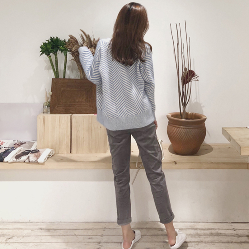 / 條紋針織開衫毛衣外套T恤打底衫高腰休閑褲子三件套裝女秋冬新款