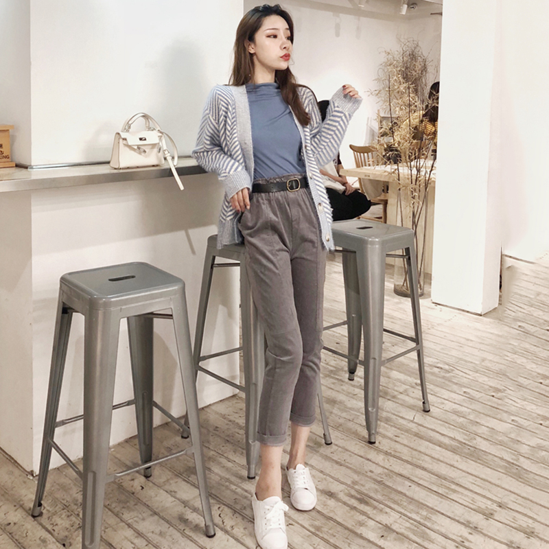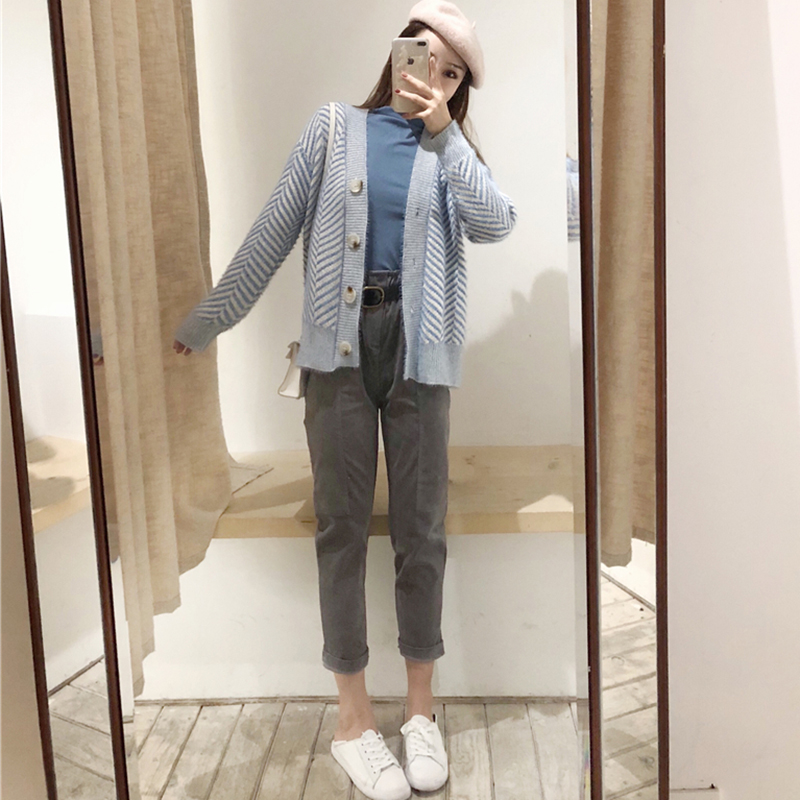 藍色打底T恤|灰色休閑褲【送腰帶】|藍色毛衣開衫
