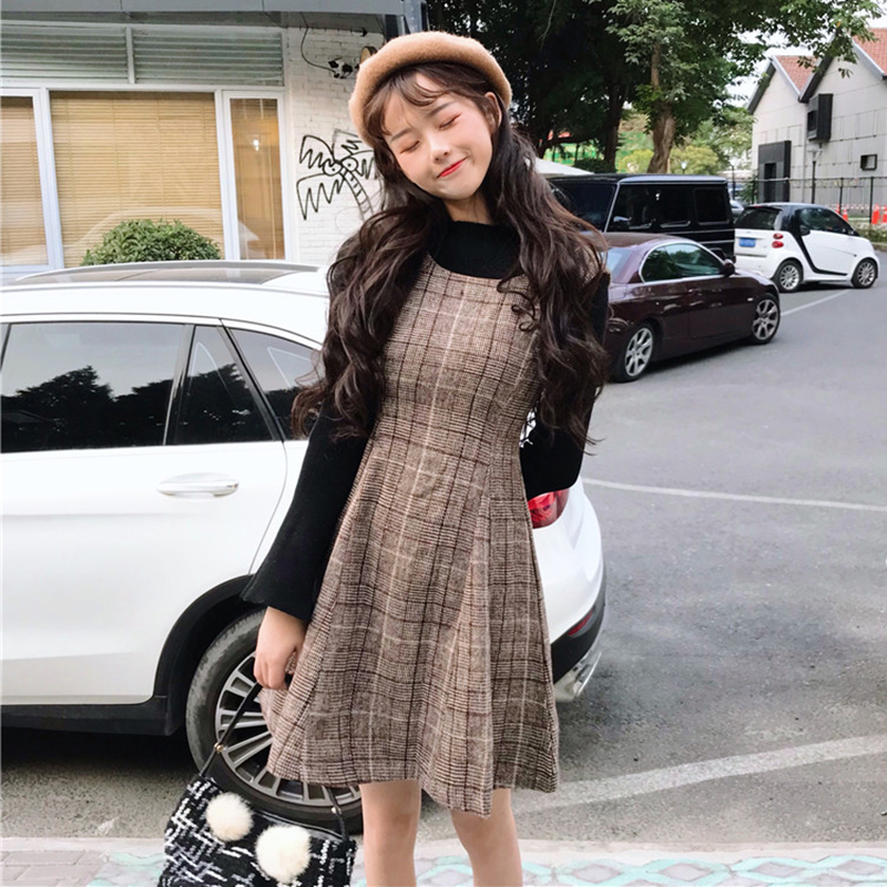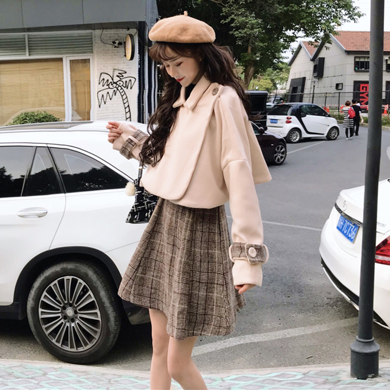/ 洋氣兩件套裝女秋冬新款毛呢斗篷外套修身內搭吊帶格子a字連衣裙