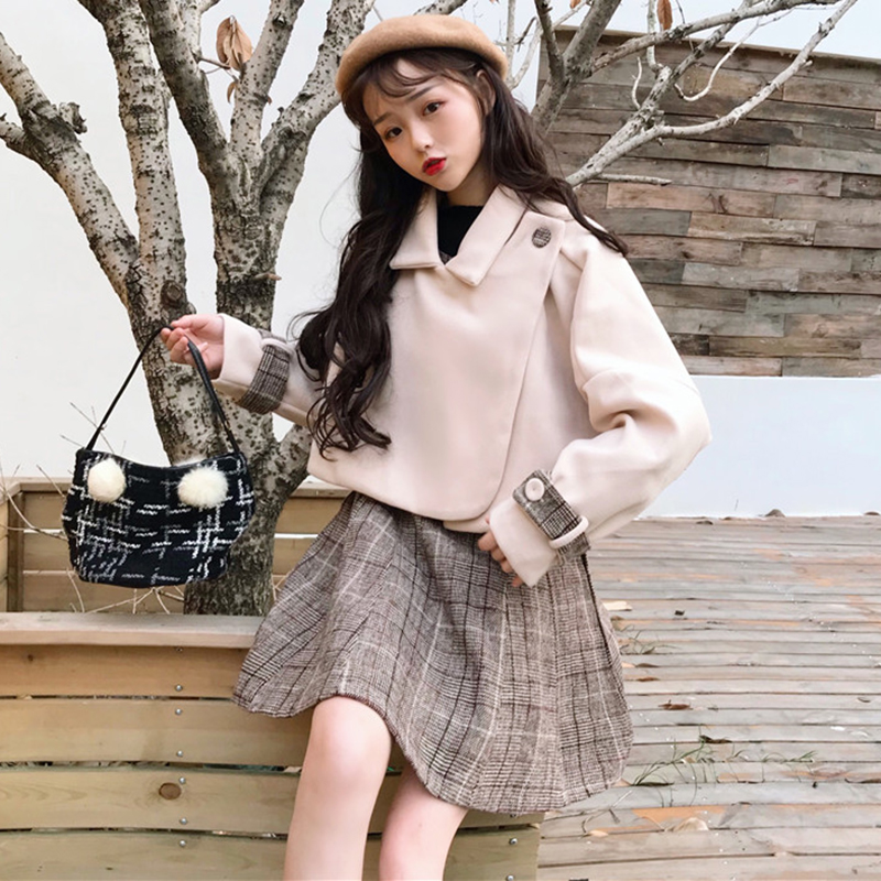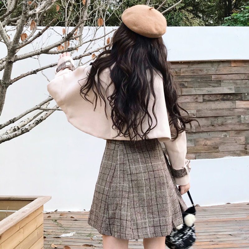 杏色外套|格子裙