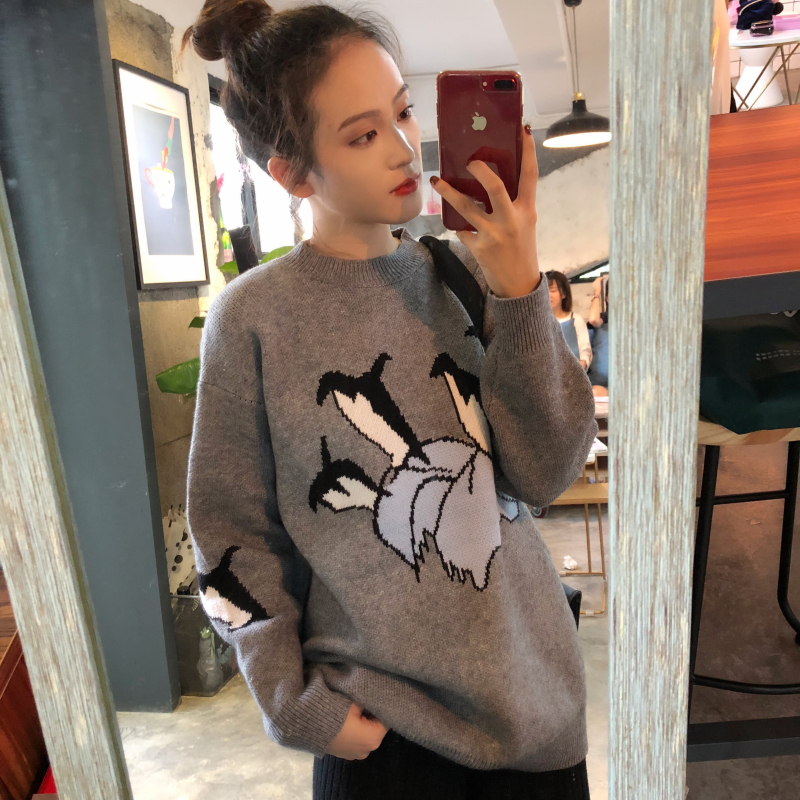 2018新款秋冬女裝韓版寬松企鵝提花套頭網紅針織衫毛衣上衣外套女