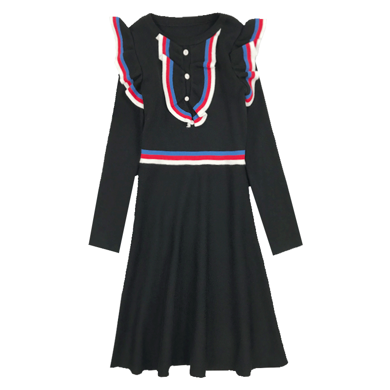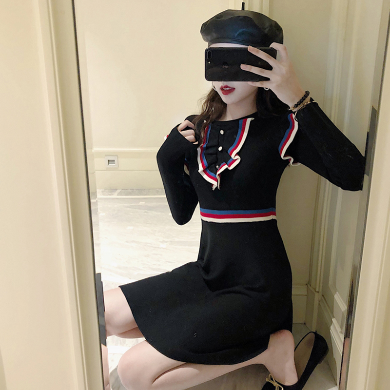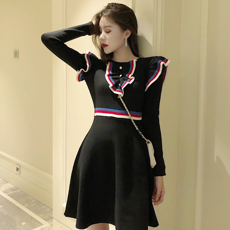 針織裙子女秋冬裝2018新款韓版氣質修身顯瘦荷葉邊長袖A字連衣裙