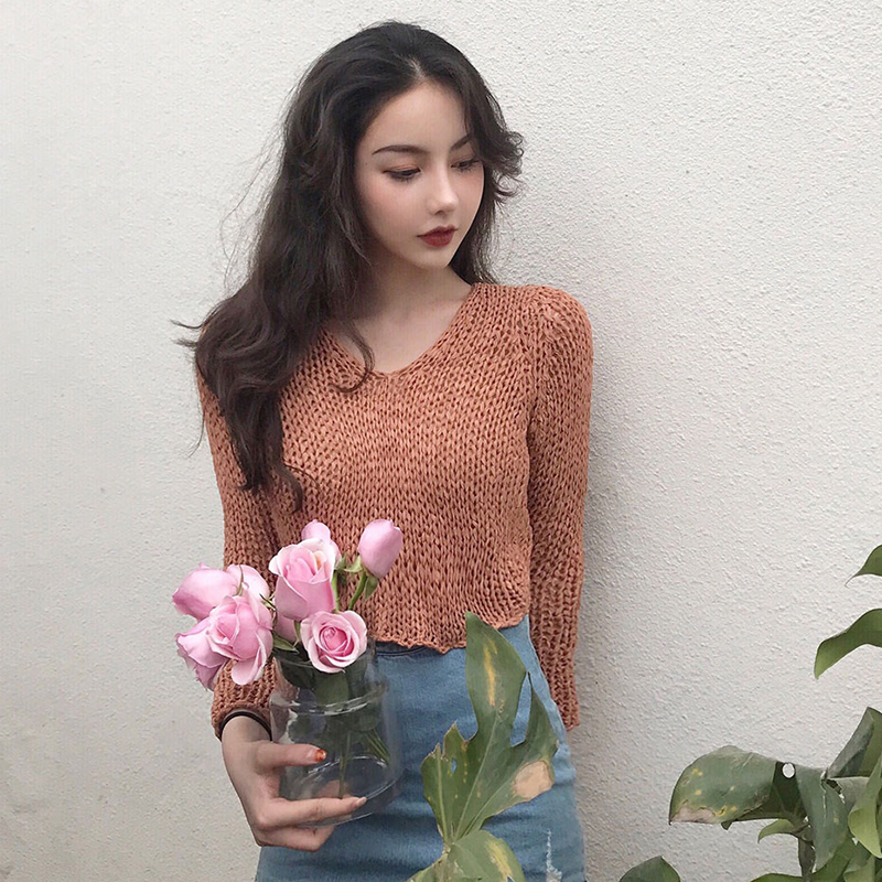 / 港味復古短款修身針織衫女秋裝薄毛衣長袖V領上衣2018新款打底衫