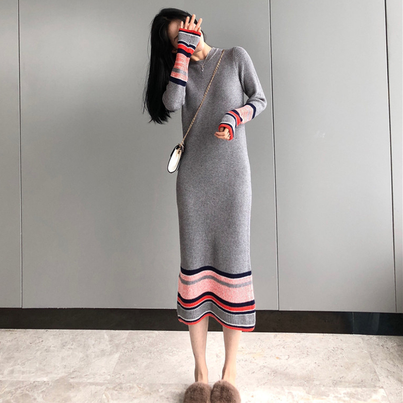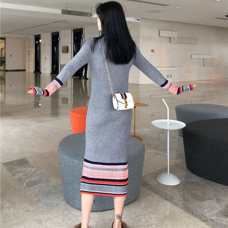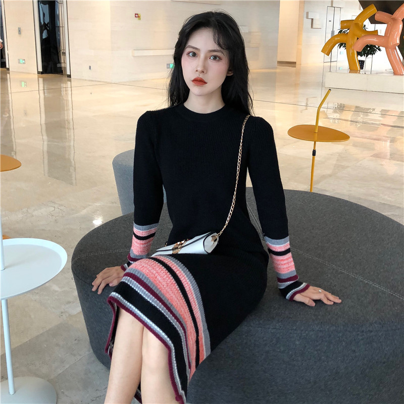 chic風裙子女秋冬裝2018新款韓版氣質修身拼色套頭針織長袖連衣裙