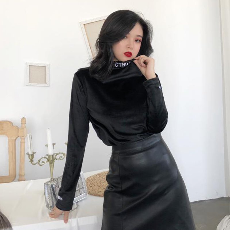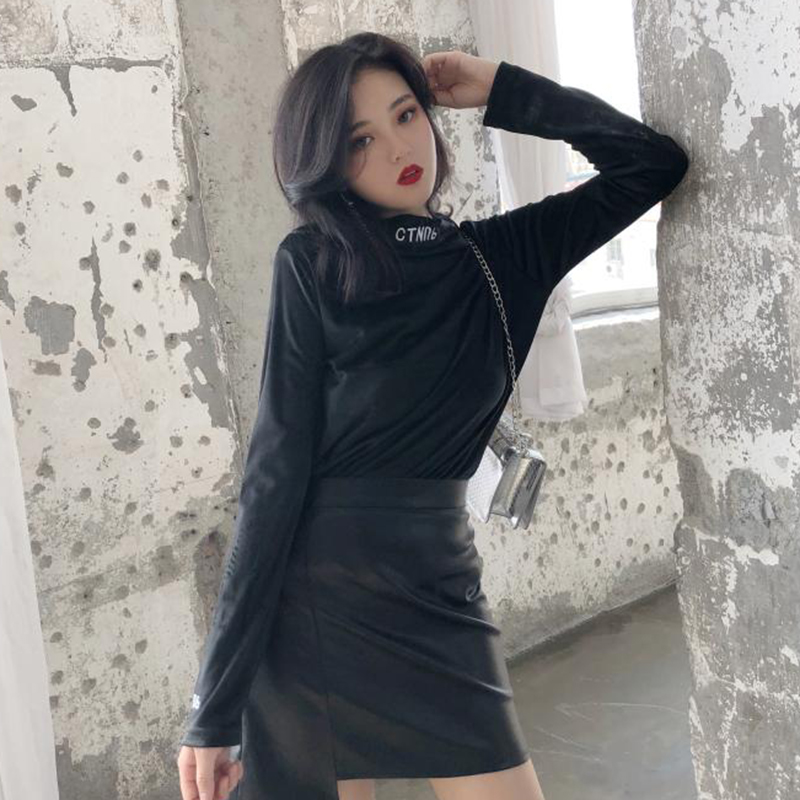 中長款字母刺繡上衣秋裝女2018新款港味修身打底衫小高領長袖T恤