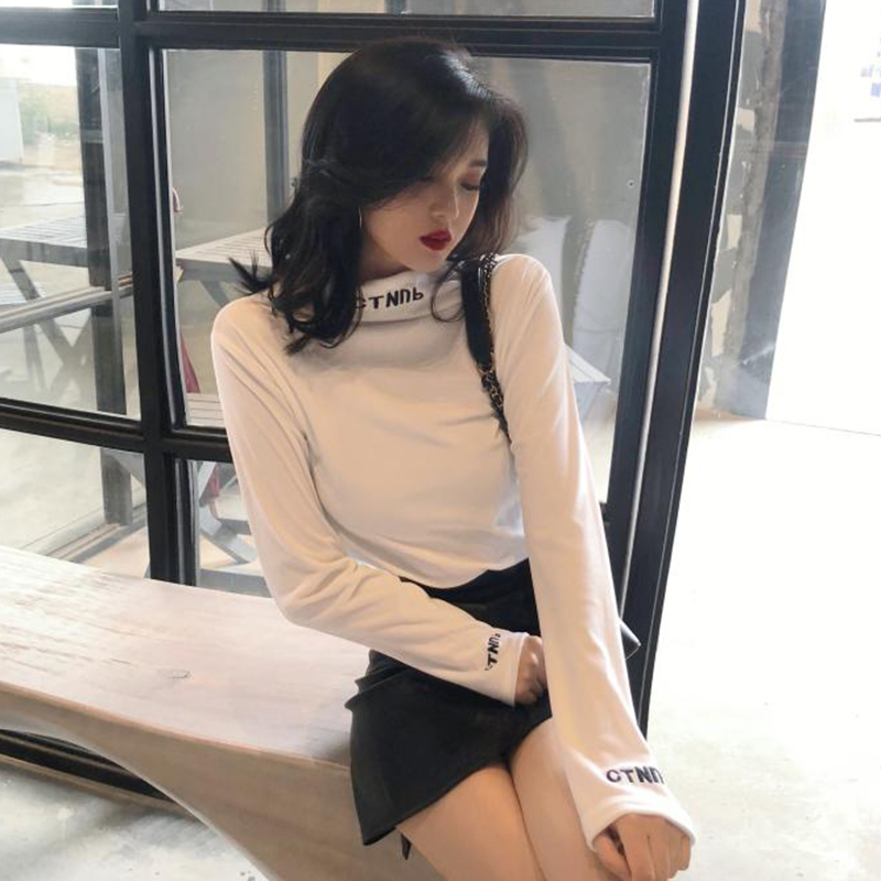 / 中長款字母刺繡上衣秋裝女2018新款港味修身打底衫小高領長袖T恤