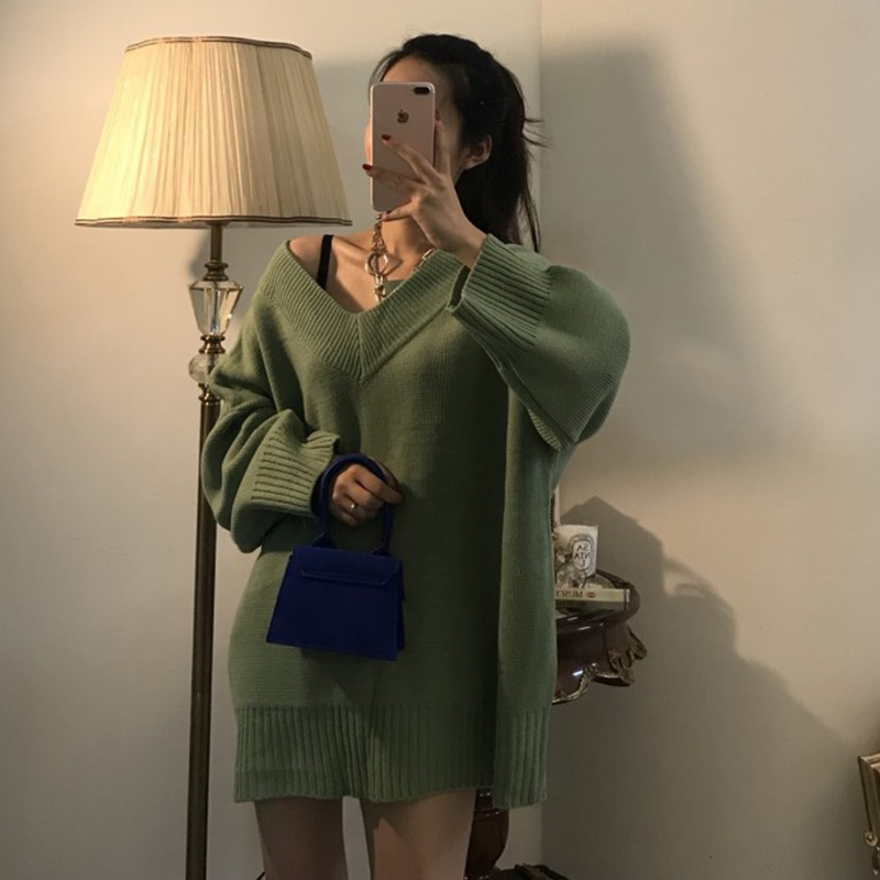 韓版寬松純色針織衫秋裝女新款慵懶風套頭毛衣漏鎖骨V領長袖上衣