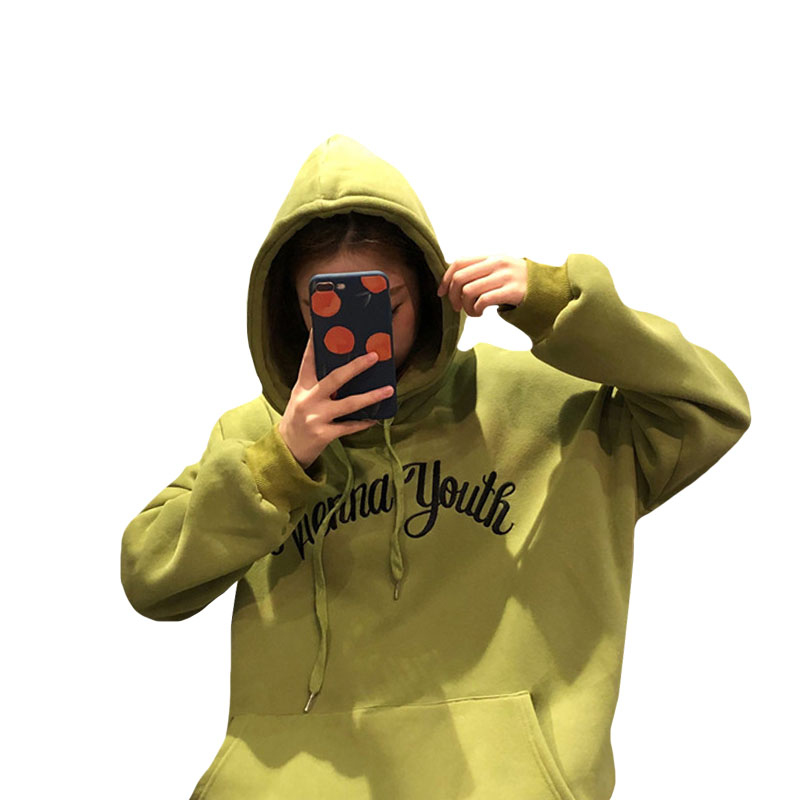 秋冬女裝韓版中長款慵懶風寬松加絨加厚字母刺繡連帽衛衣上衣外套