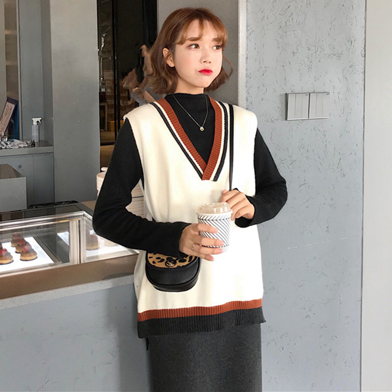 / 學院風針織衫馬甲女秋裝新款寬松小開叉撞色V領無袖背心上衣外套