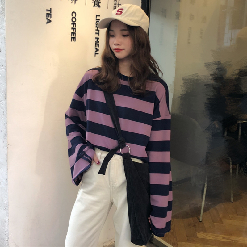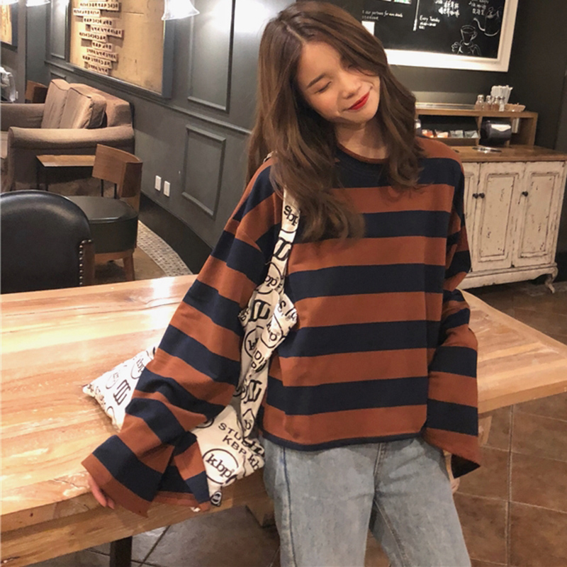 慵懶上衣秋裝女2018新款韓版寬松條紋小清新學生長袖T恤打底衫潮