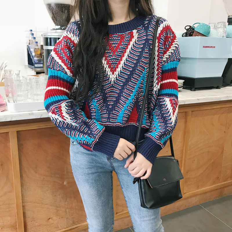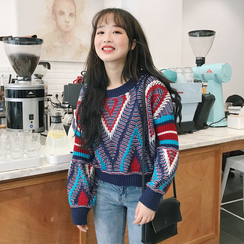 / 小清新慵懶風針織毛衣秋裝女新款寬松套頭短上衣學生時尚幾何外套
