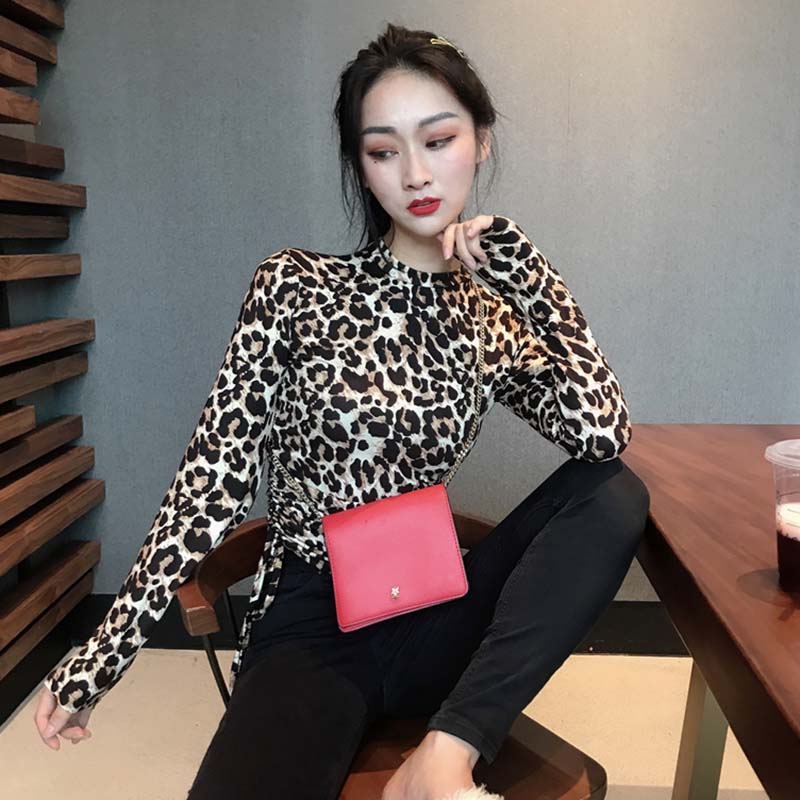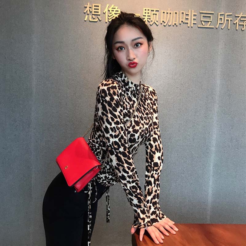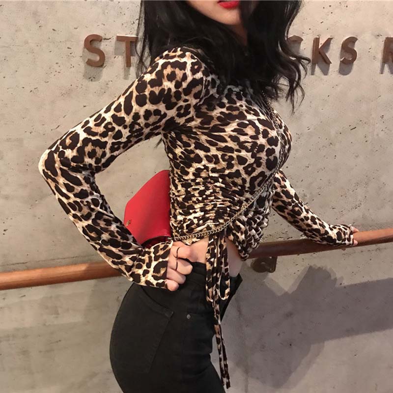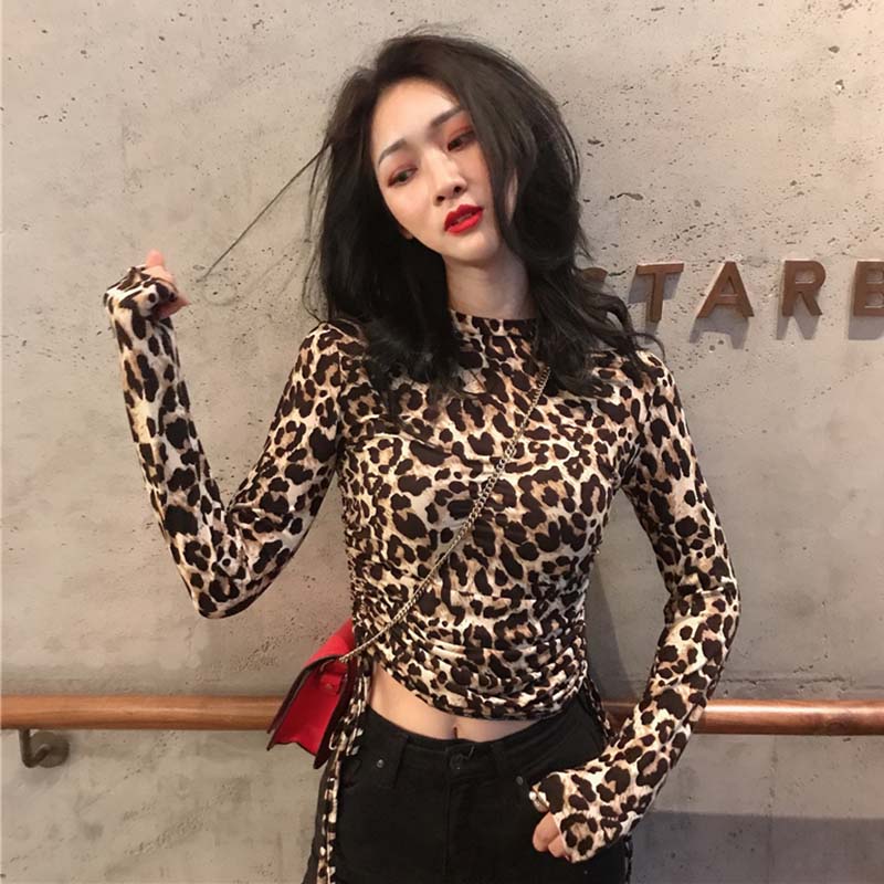 / 個性抽繩短款露臍上衣秋裝女2018新款復古豹紋修身長袖打底T恤衫