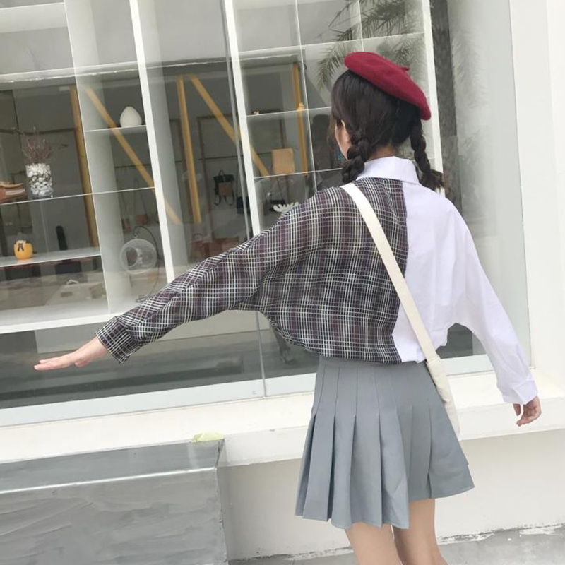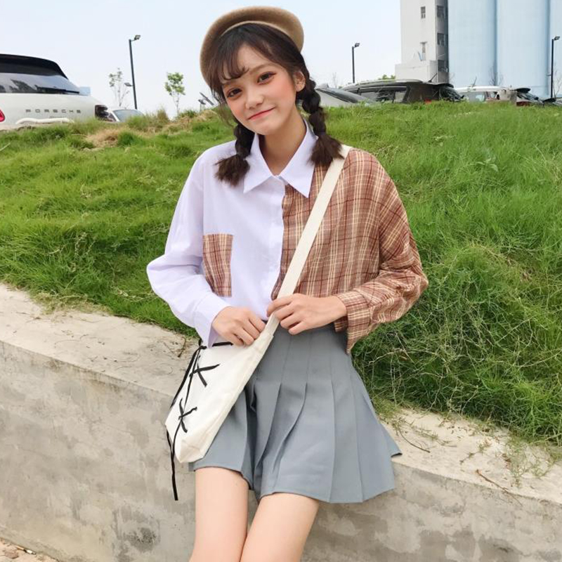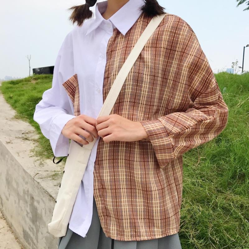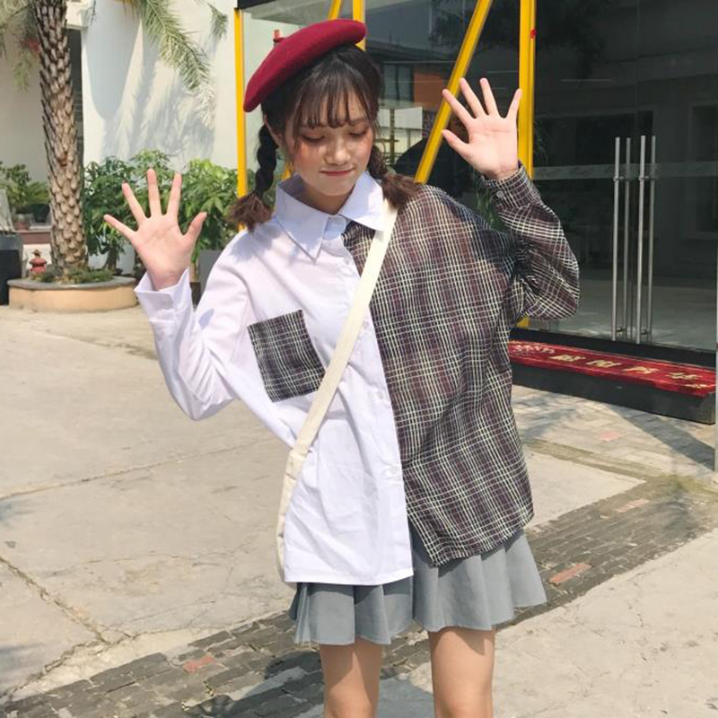 / 早春新款女裝學院風寬松顯瘦復古格子撞色寬松顯瘦學生長袖襯衫女