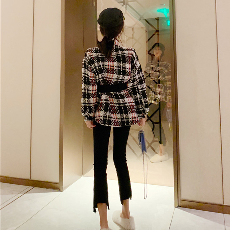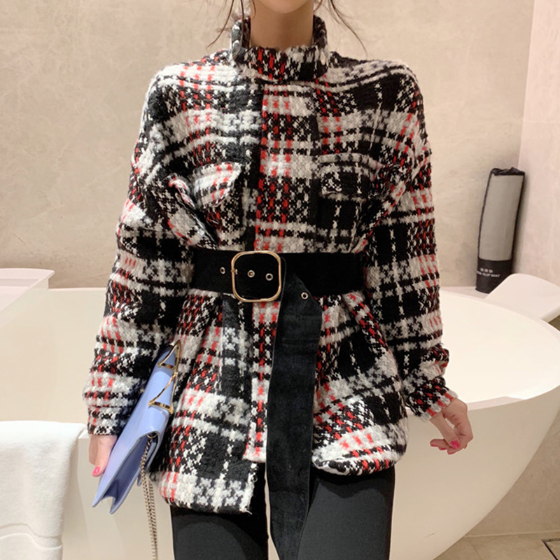 格子呢大衣秋冬女裝2018新款學生流行毛呢外套寬松長袖上衣配腰帶