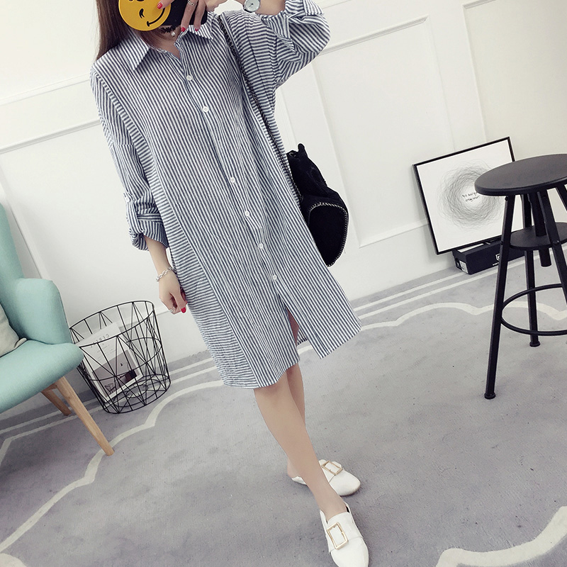 豎條紋襯衫女長袖寬松韓版中長款春裝新款百搭學生襯衣學院風