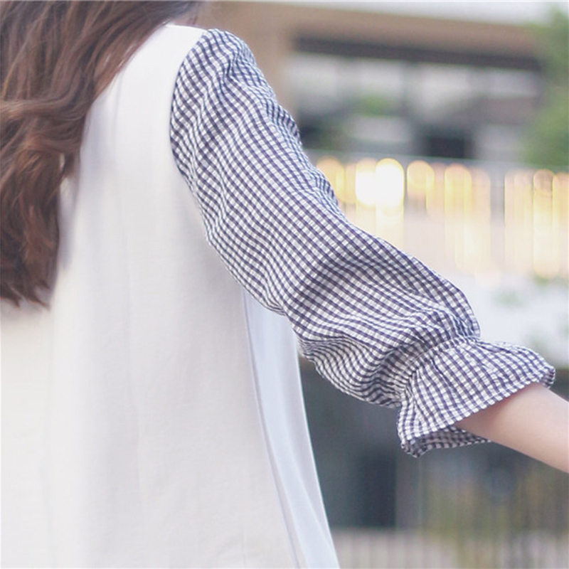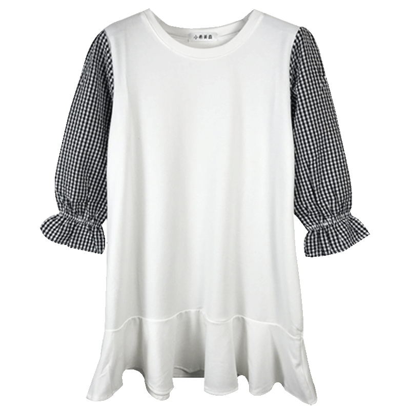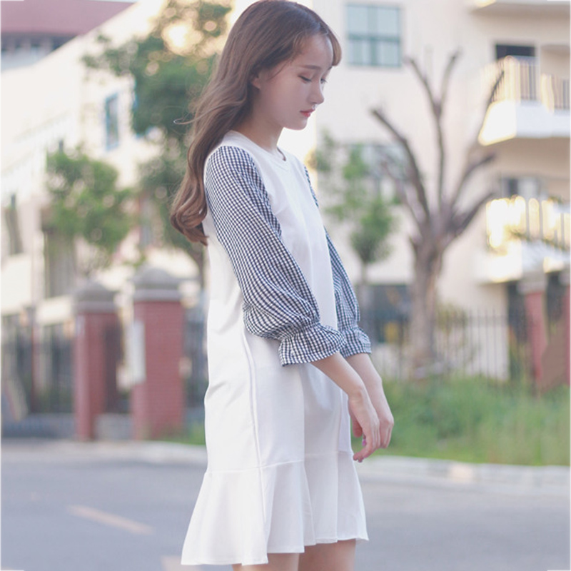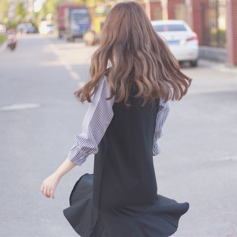 / 早秋2018新款女裝韓版格子拼接喇叭袖連衣裙學生休閑荷葉邊短裙子