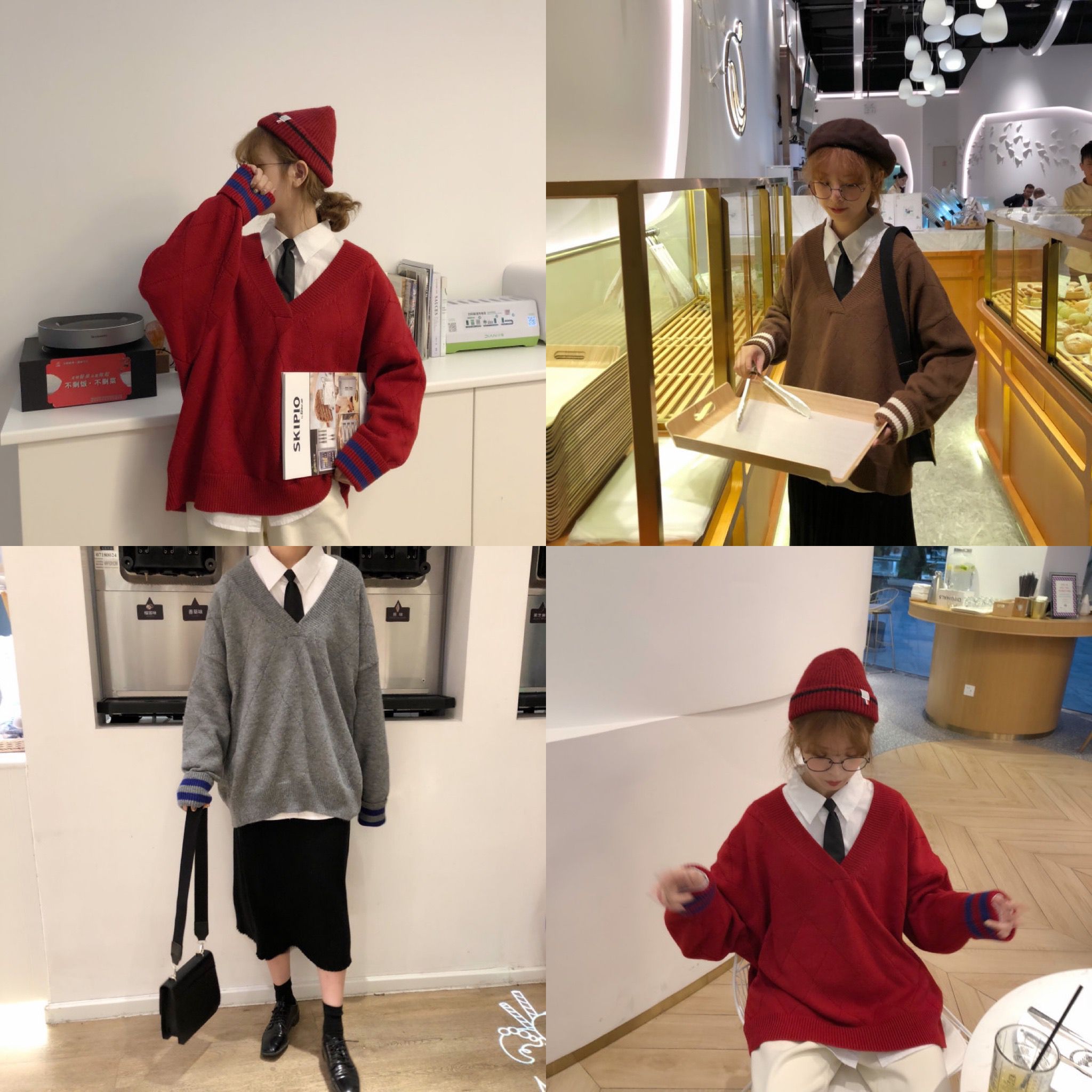 可可里小姐~韓版寬松百搭減齡V領毛衣+百搭純色襯衫帶領帶