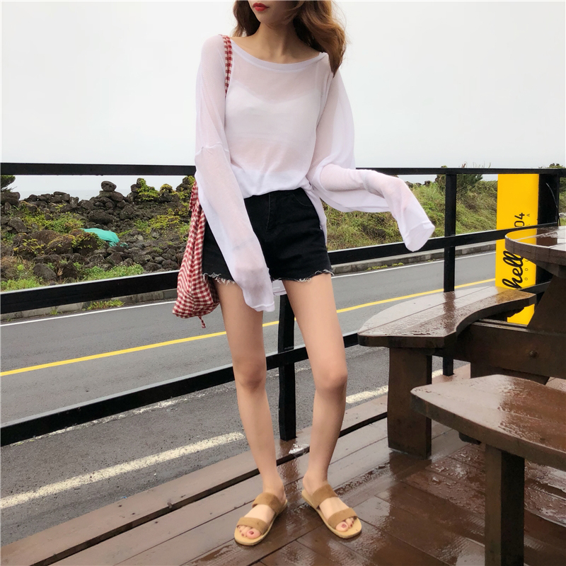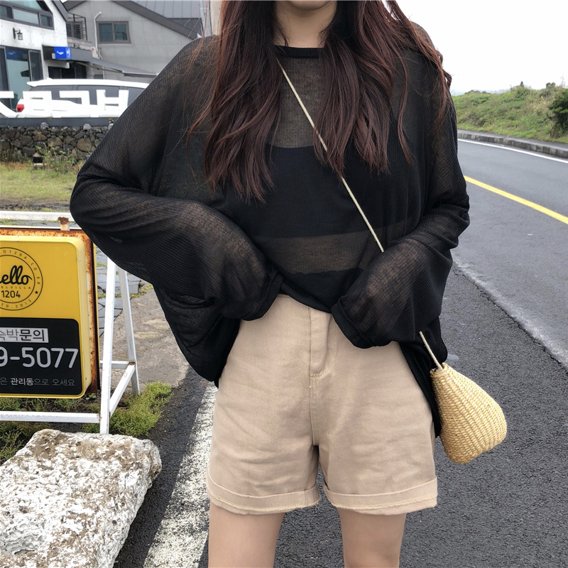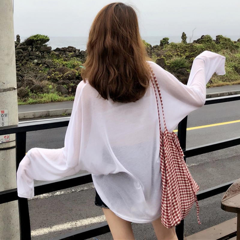 / 夏季韓版港味復古寬松透視薄款罩衫百搭長袖T恤女新款防曬衫上衣