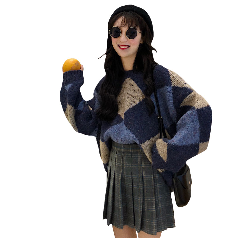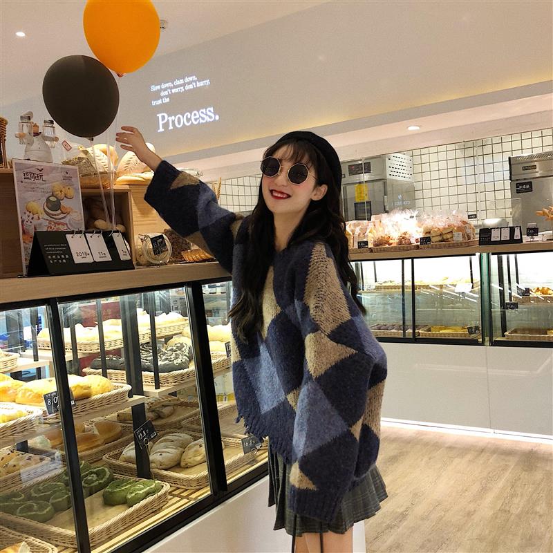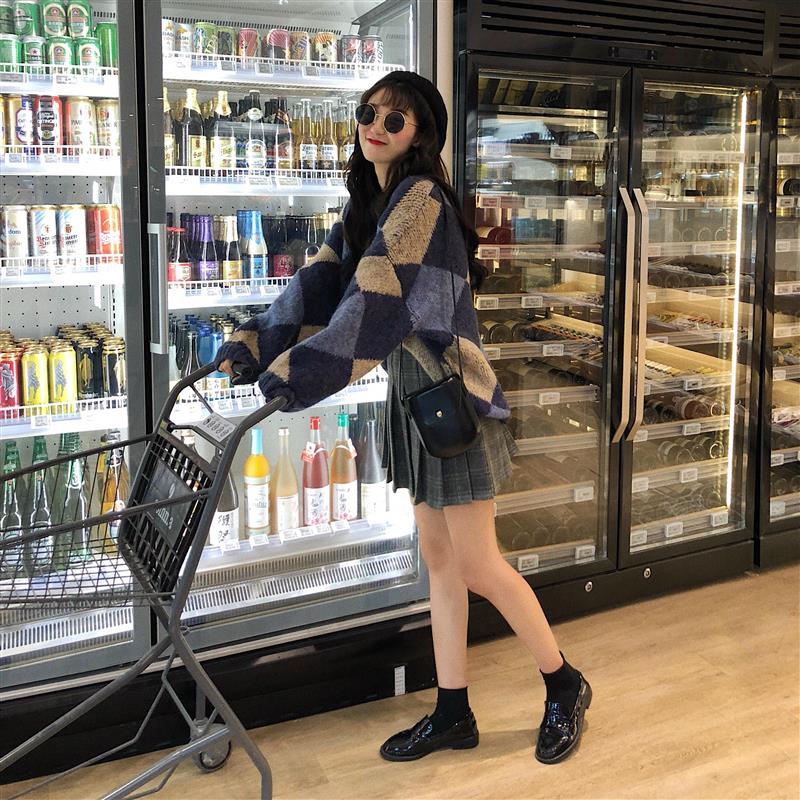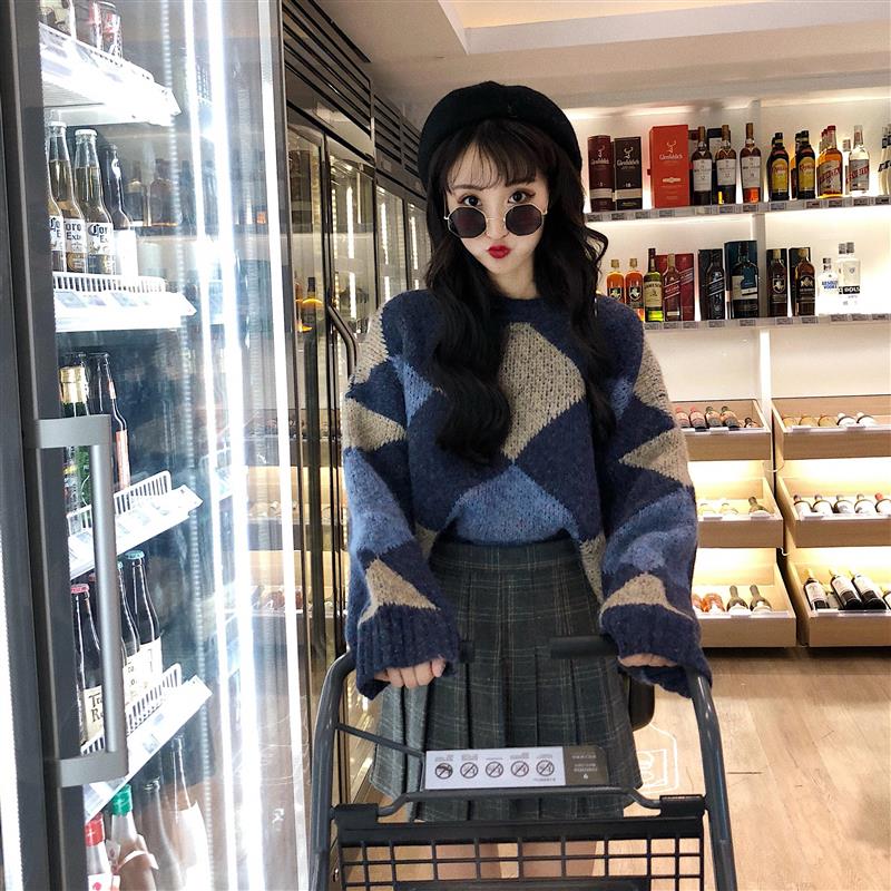 / 韓版時尚休閑套裝秋冬女裝毛邊菱格針織毛衣+格子a字百褶裙兩件套