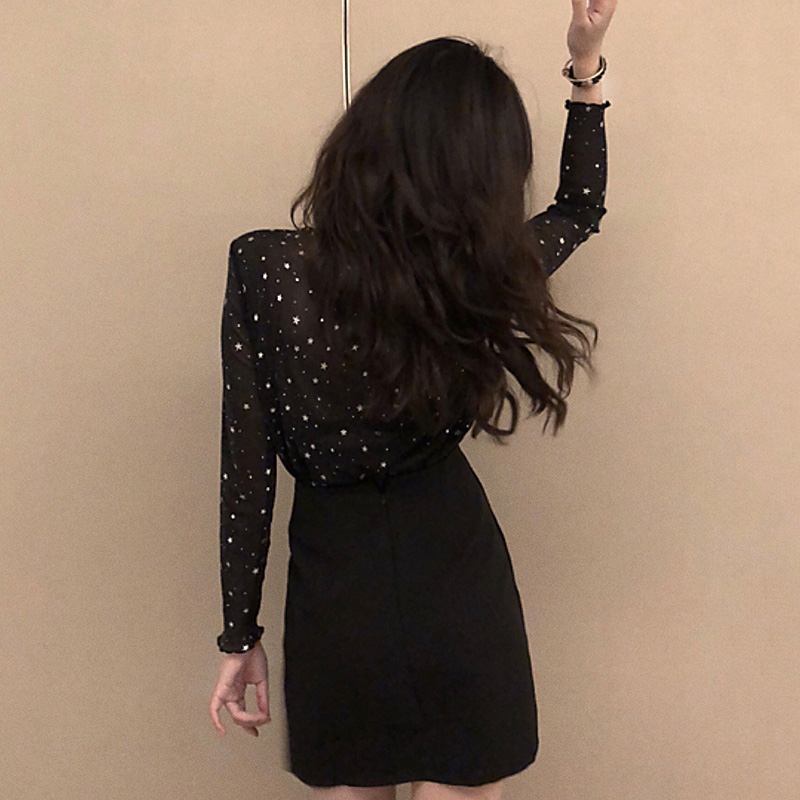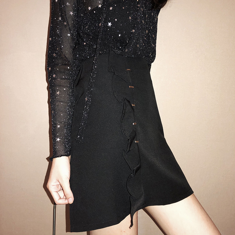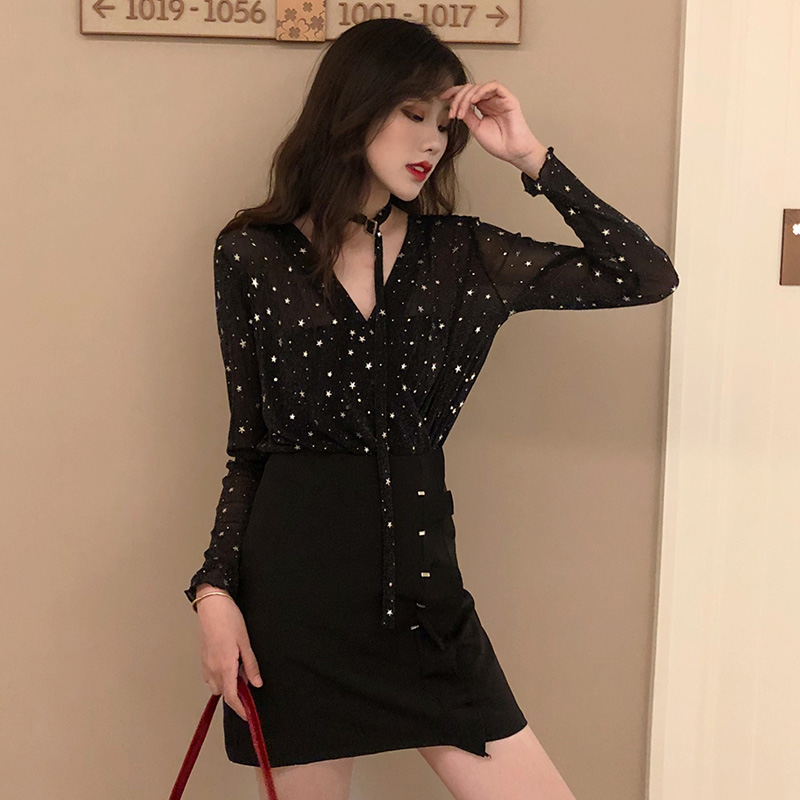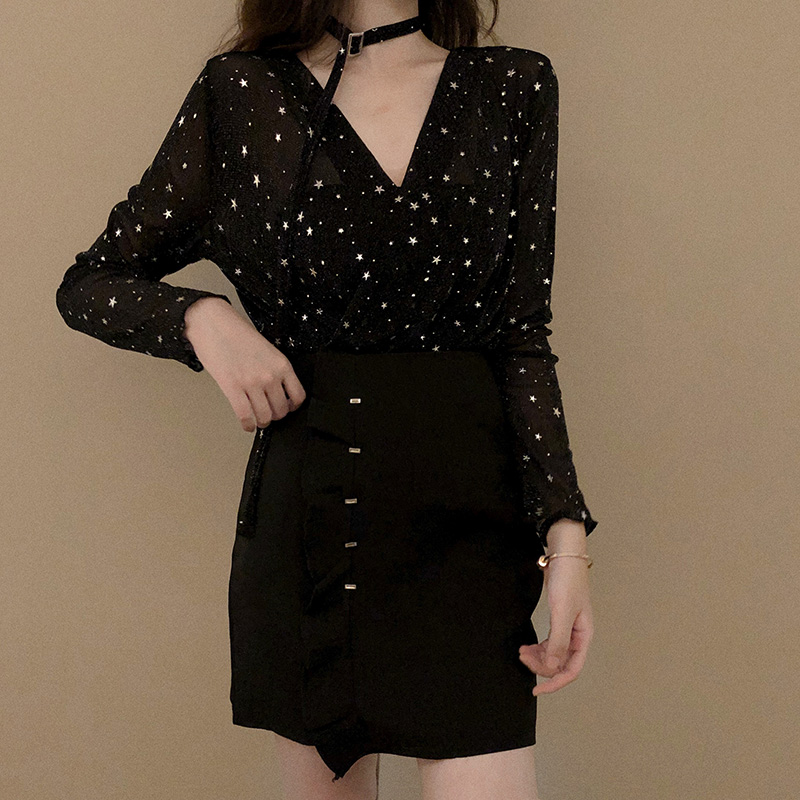 / 套裝女秋新款星星V領長袖打底衫上衣高腰顯瘦荷葉邊黑色A字短裙子
