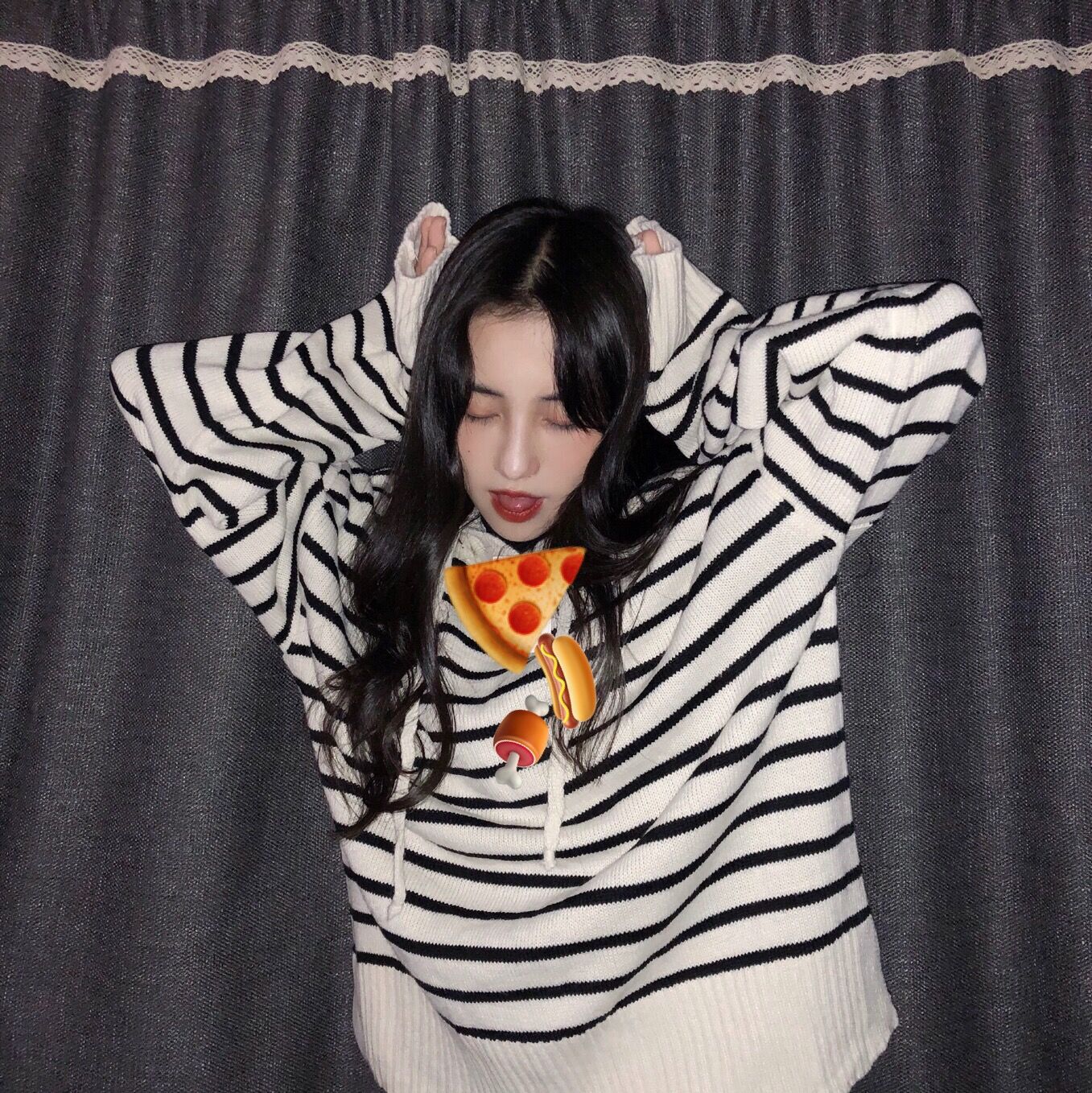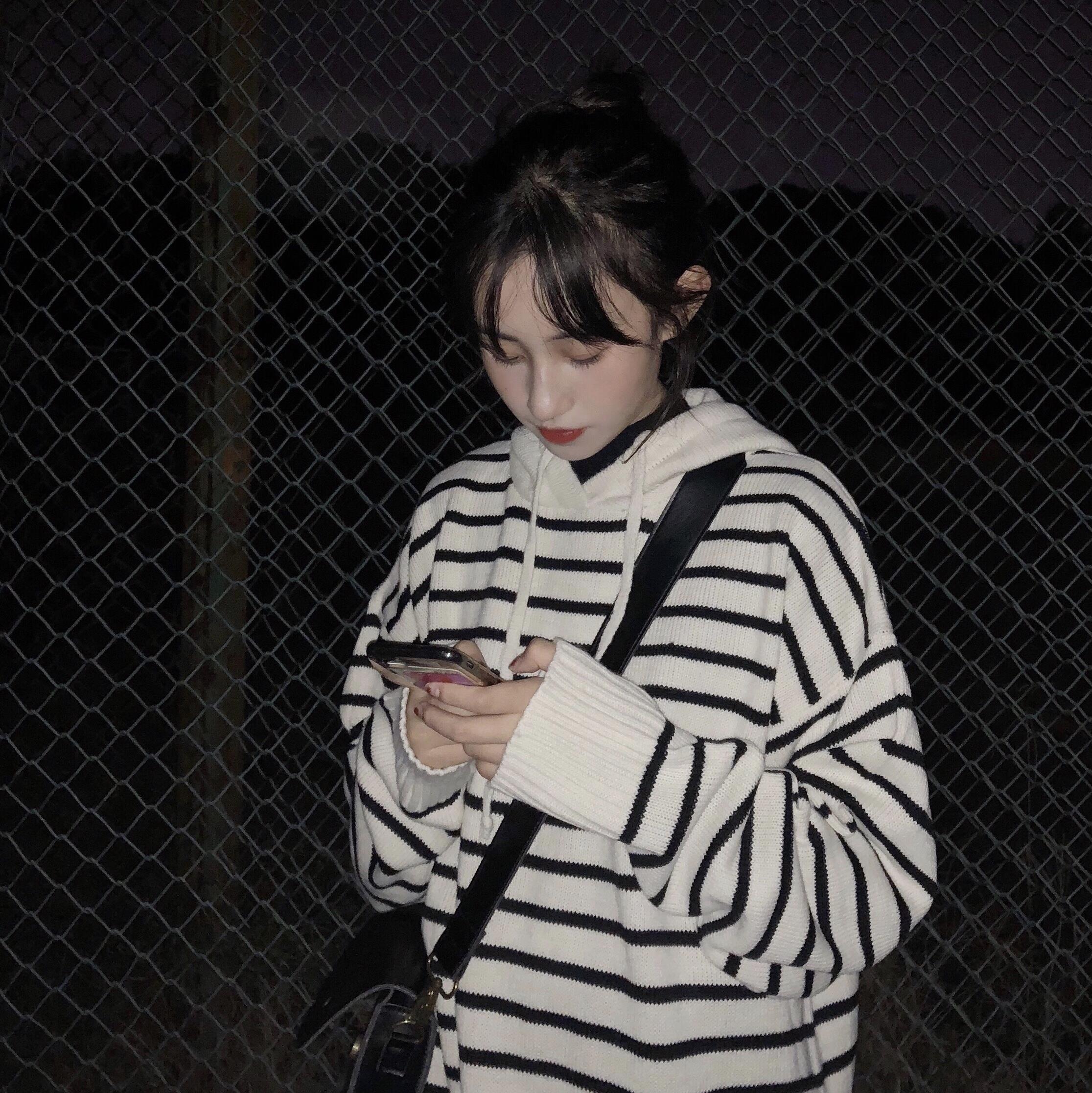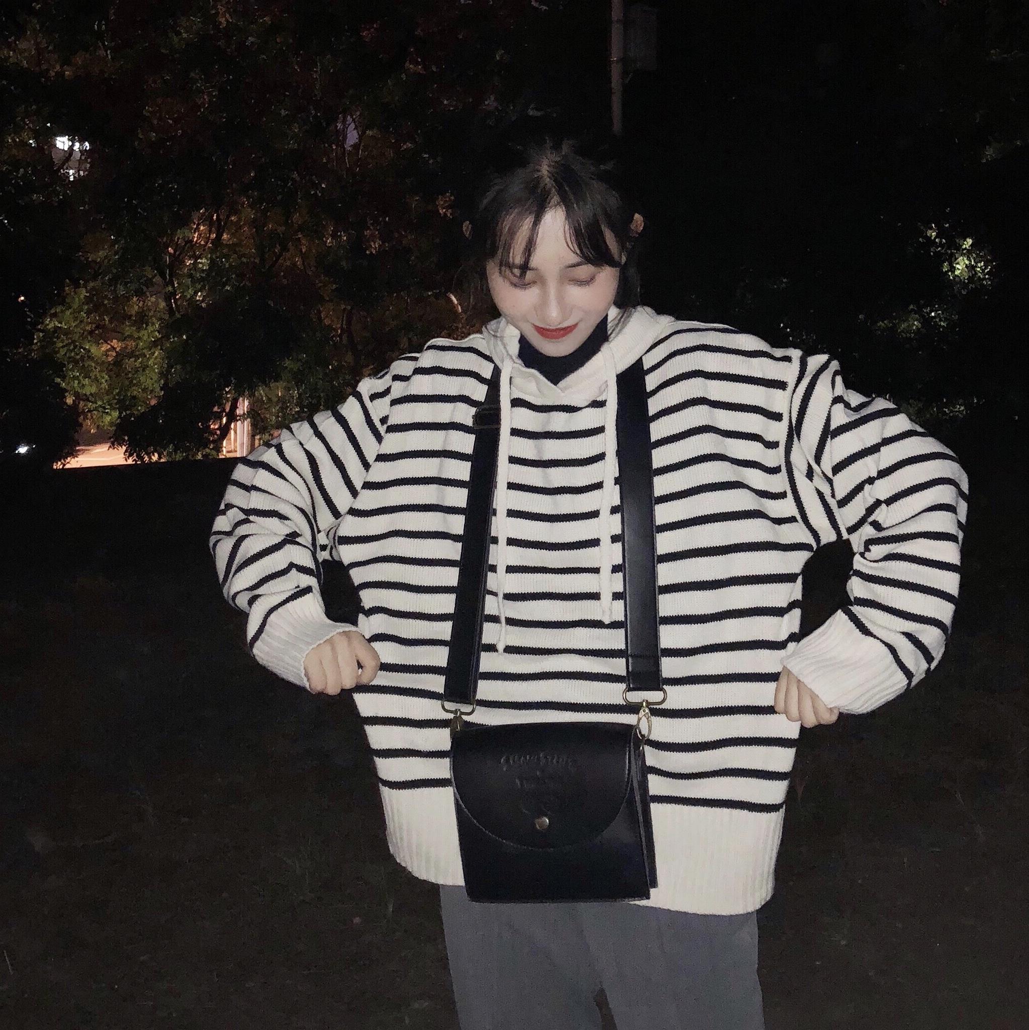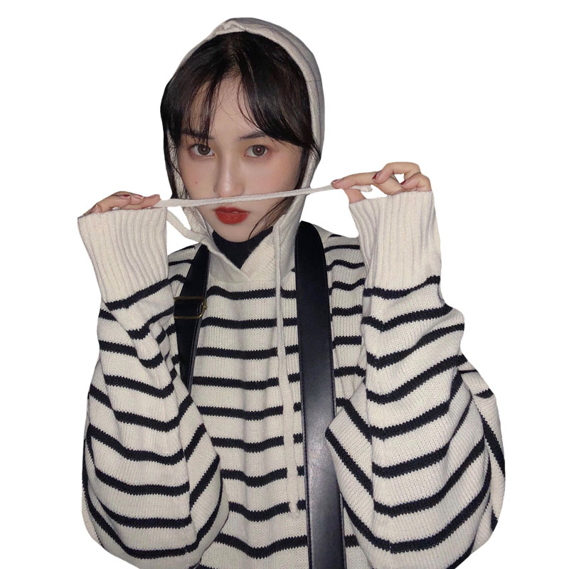 / 秋冬韓版復古學院風慵懶風條紋寬松連帽套頭針織衫毛衣上衣外套女