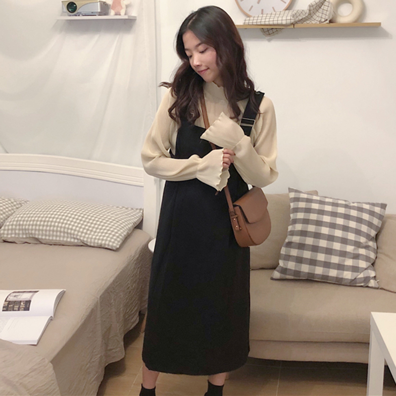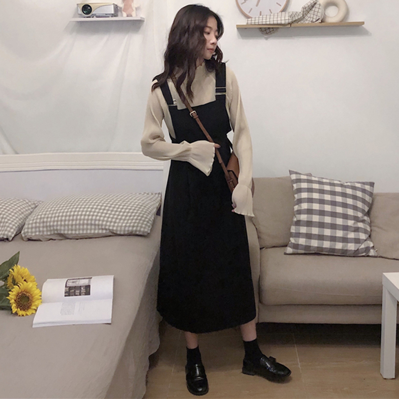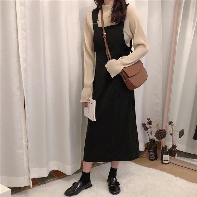 / 御姐套裝女秋冬新款時尚黑色休閑背帶連衣裙子洋氣百褶雪紡衫上衣