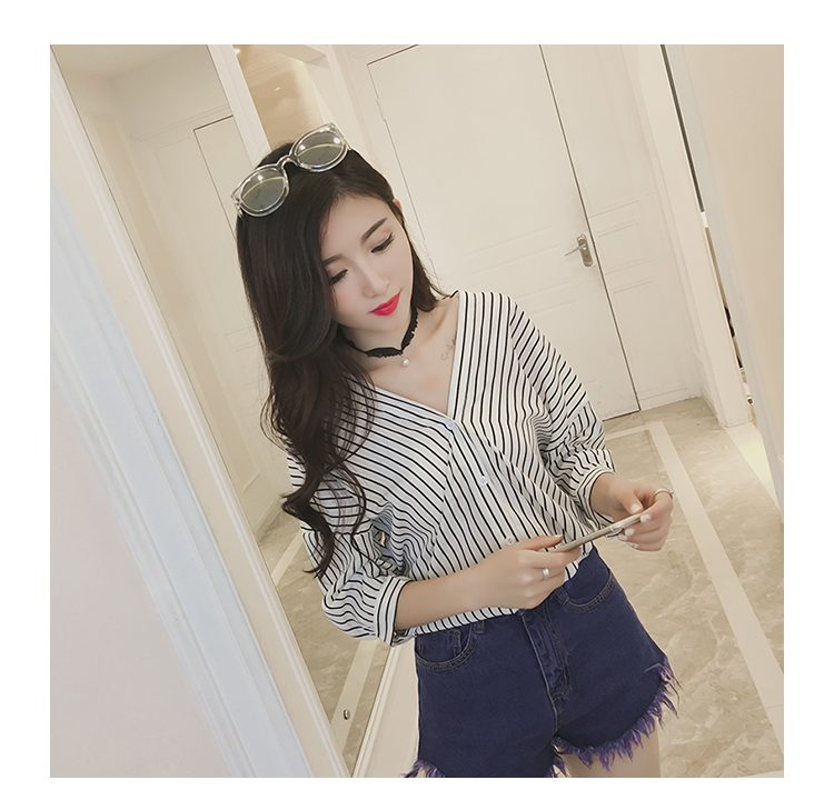 秋裝2018新款夏韓范時尚寬松顯瘦學生豎條紋V領襯衫女蝙蝠袖上衣