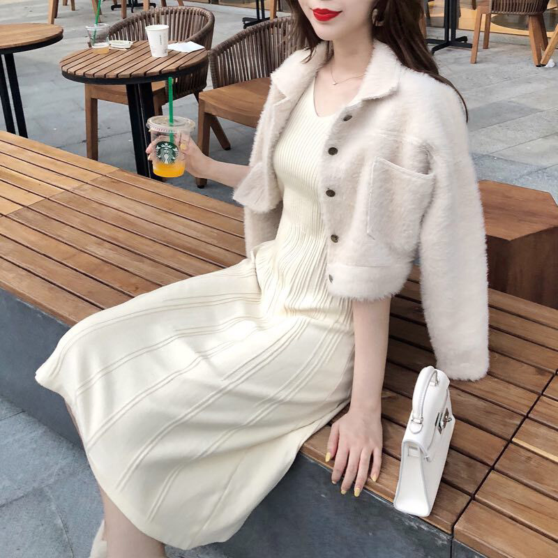 / 毛衣加裙子兩件套秋裝2018新款寬松短款毛絨外套休閑背心針織長裙