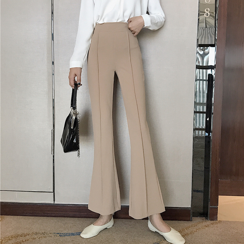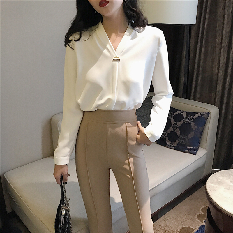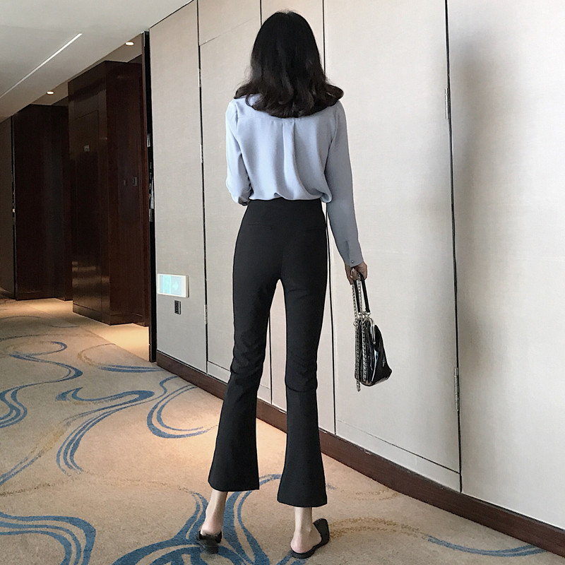 / 時尚套裝女秋季新款高腰黑色喇叭長褲子氣質修身V領雪紡襯衫上衣