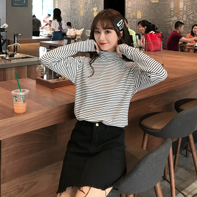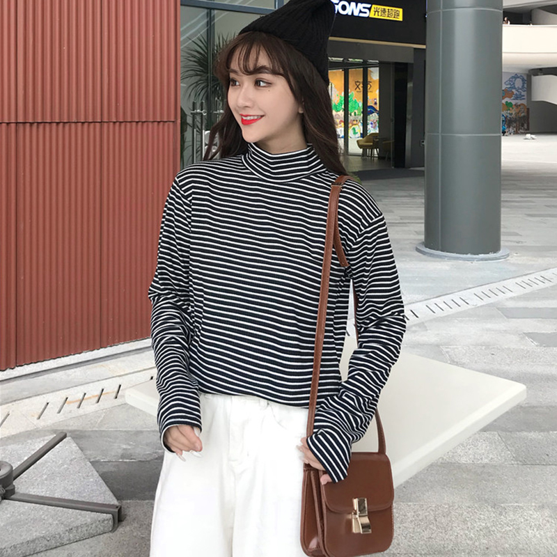 高領條紋打底衫秋裝女2018新款學生T恤衣服修身顯瘦長袖體恤上衣