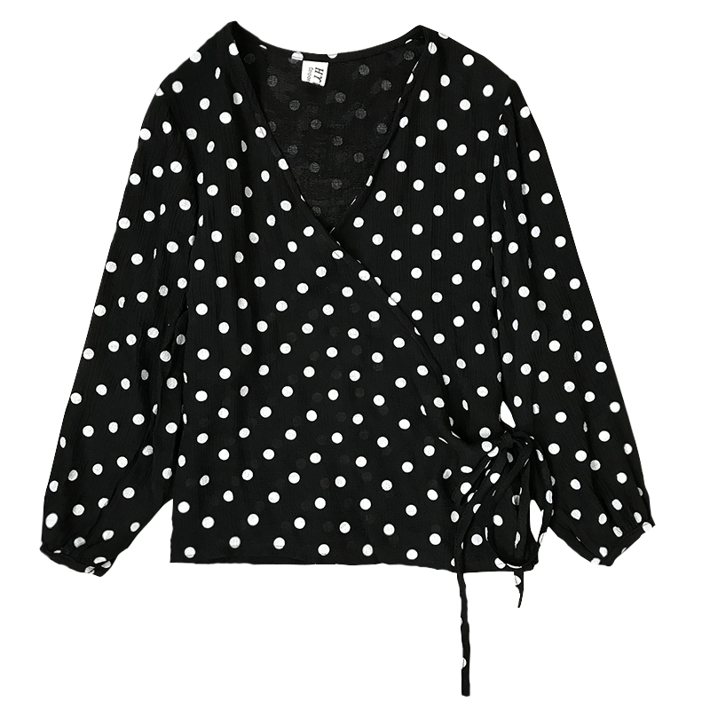 / 襯衣女夏季新款韓版女裝交叉v領七分袖波點襯衫系帶修身顯瘦上衣