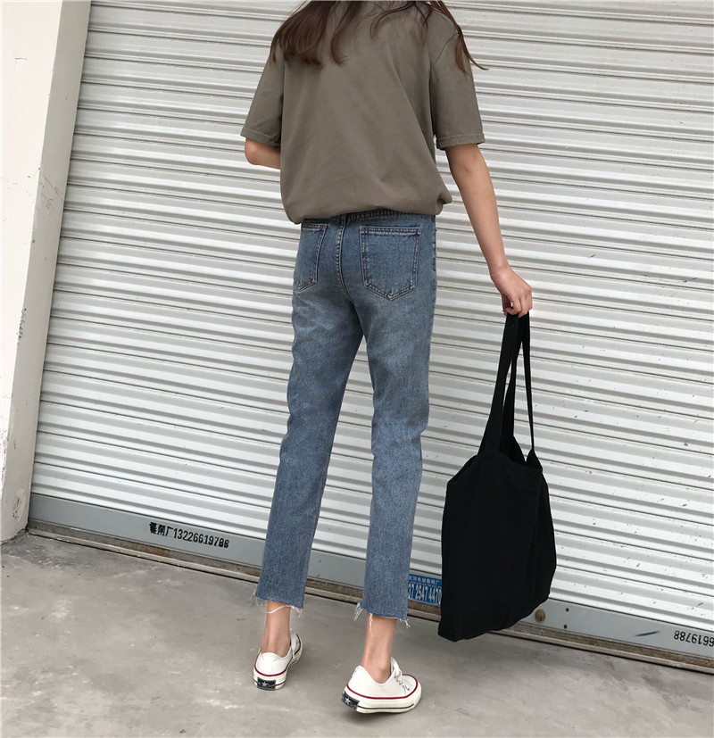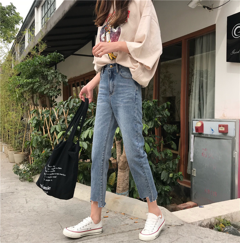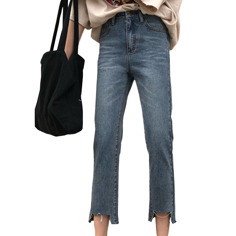 / 春季新款女裝韓版寬松褲腳缺口不規則高腰牛仔褲學生九分直筒褲潮