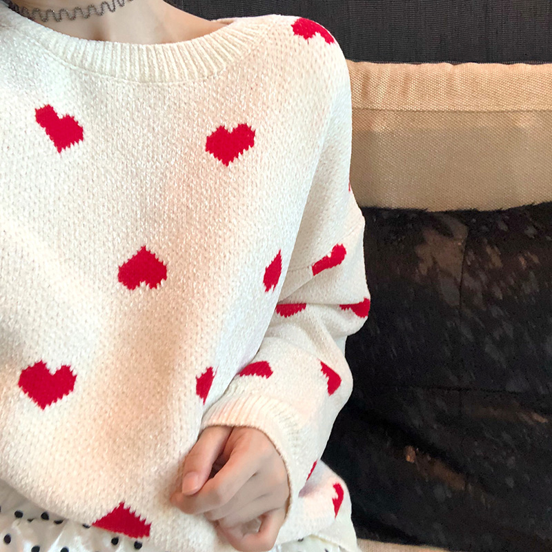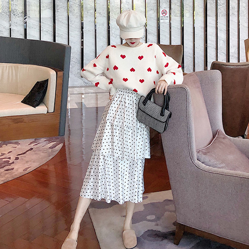 套裝女秋新款愛心圓領軟妹毛衣高腰顯瘦絲絨波點半身裙蕾絲蛋糕裙