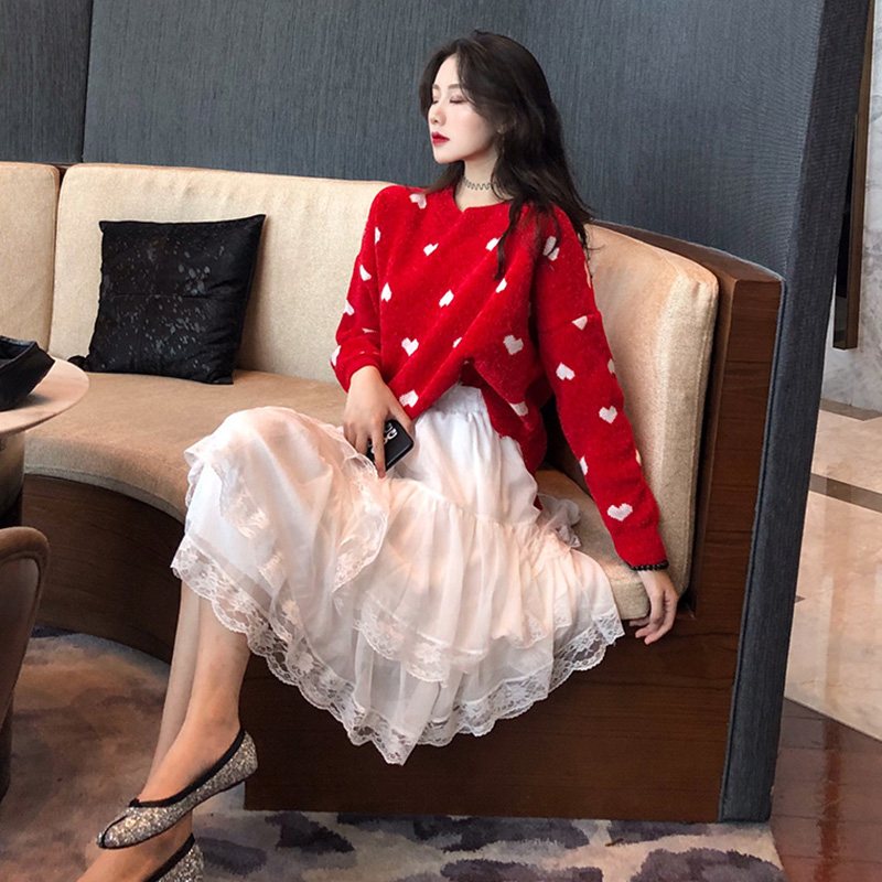 / 套裝女秋新款愛心圓領軟妹毛衣高腰顯瘦絲絨波點半身裙蕾絲蛋糕裙
