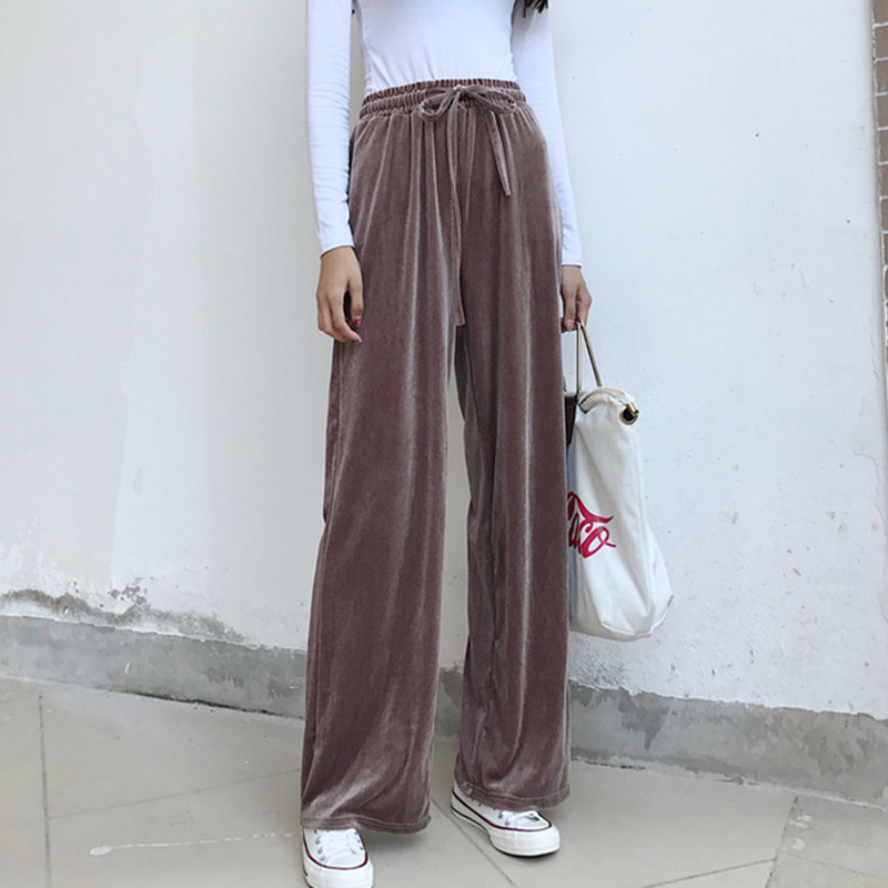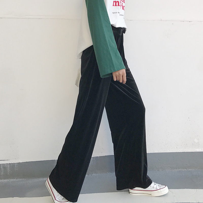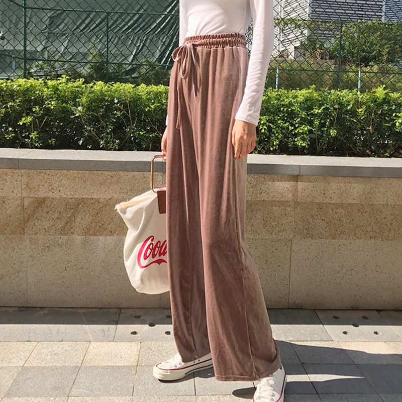 / 復古松緊高腰墜感金絲絨闊腿褲秋裝女新款學生寬松百搭休閑長褲子