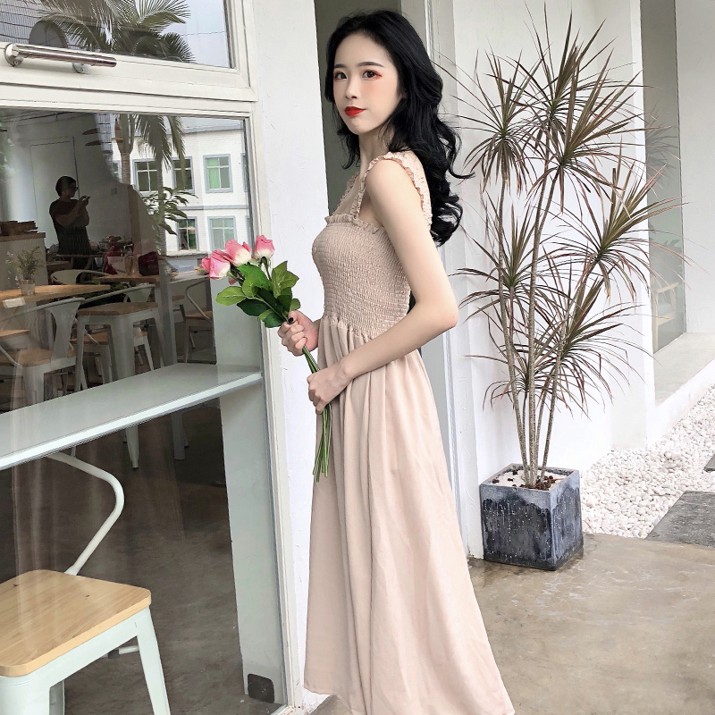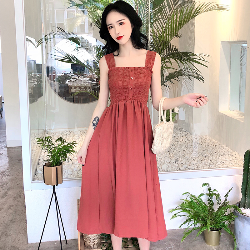 2018女夏裝新款韓版高腰顯瘦黑色吊帶連衣裙氣質無袖A字中長裙子